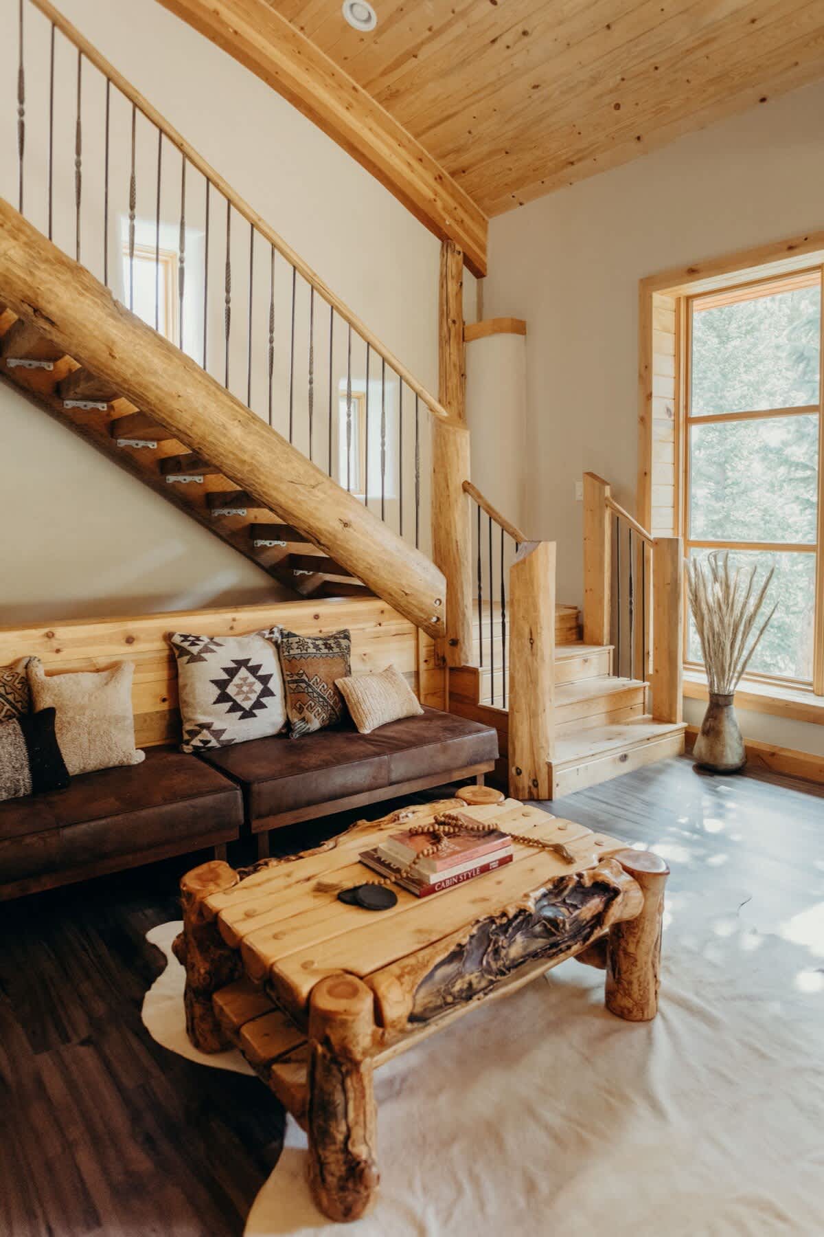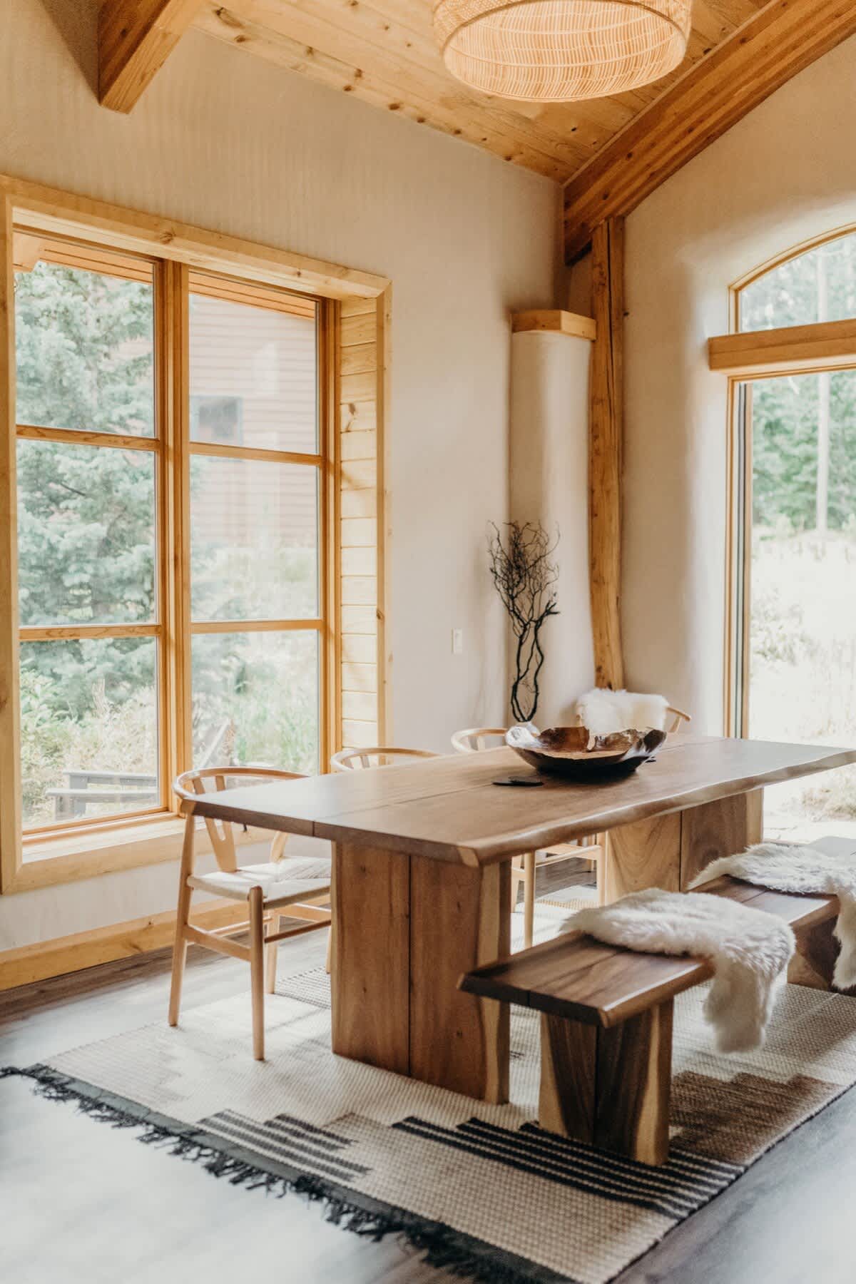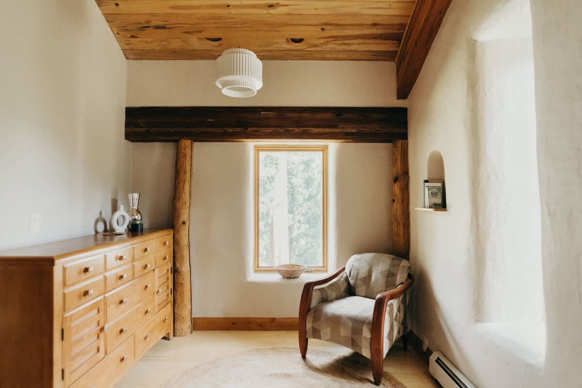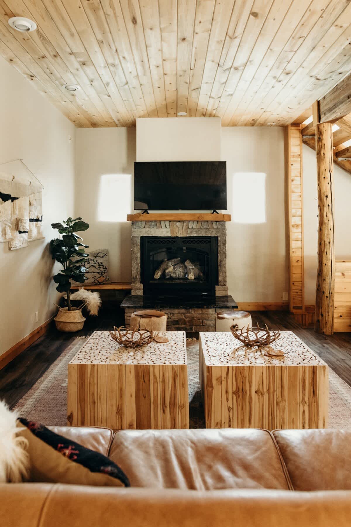 • High ceilings with wooden panels and beams throughout