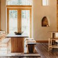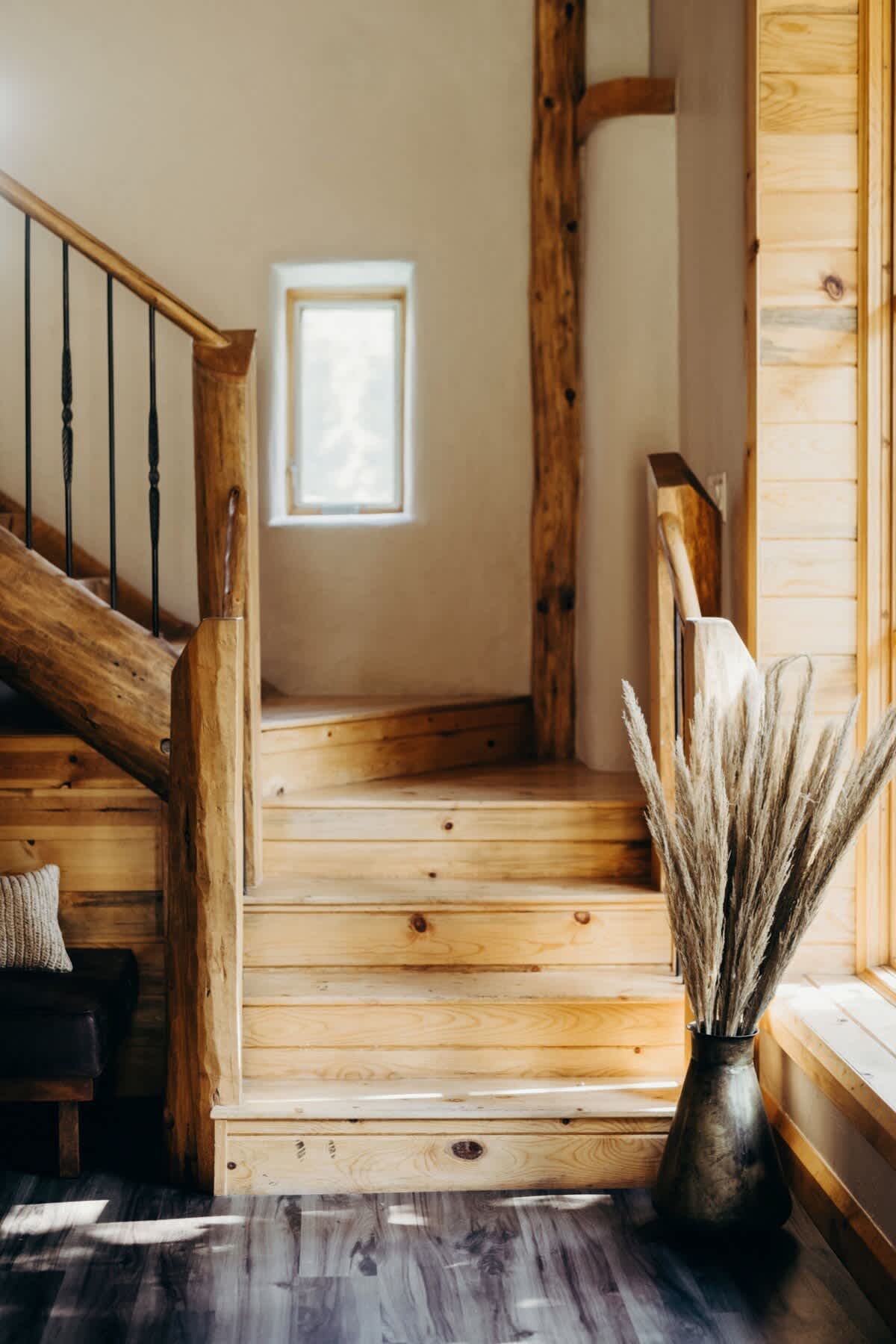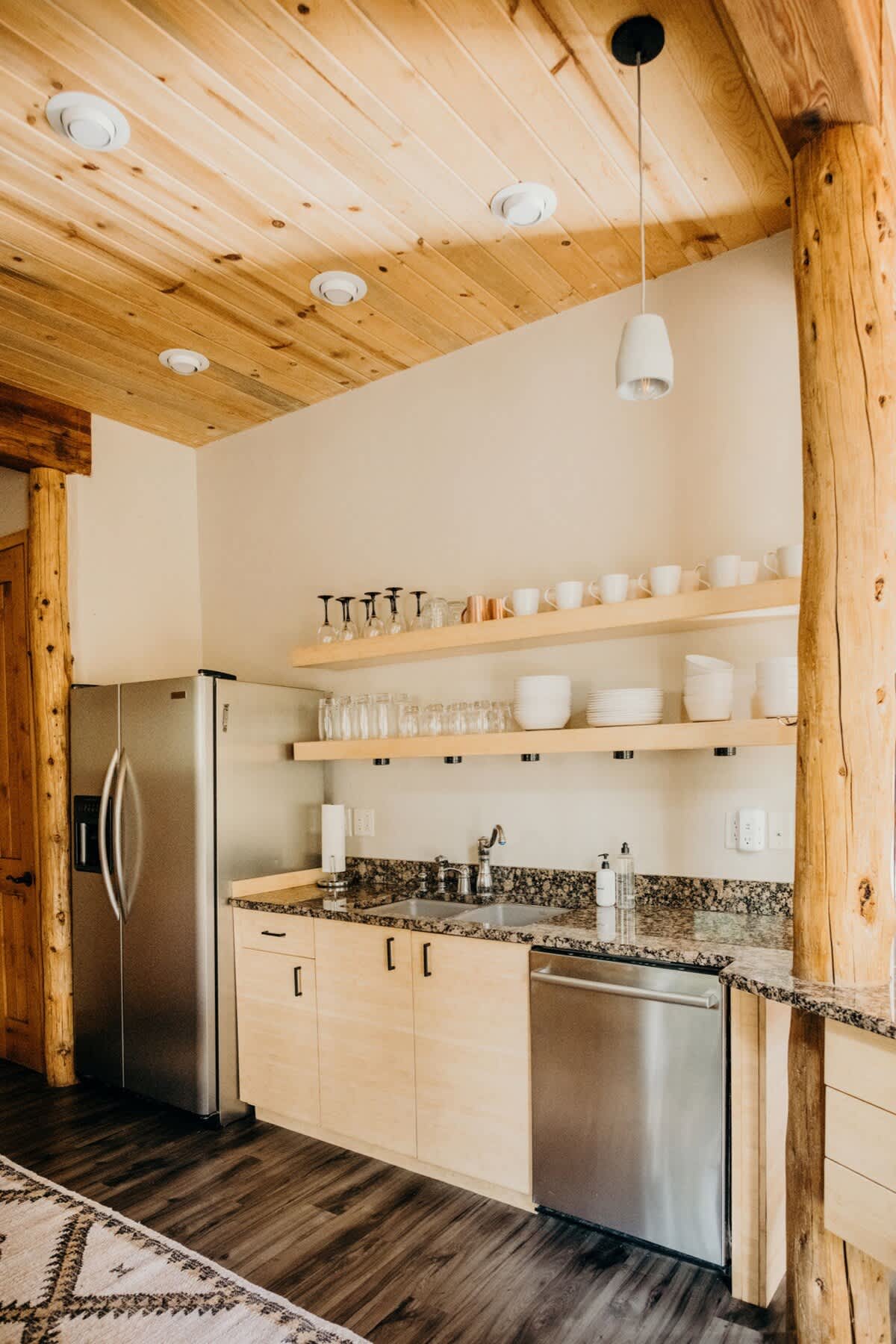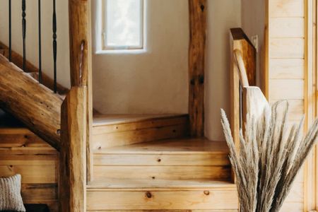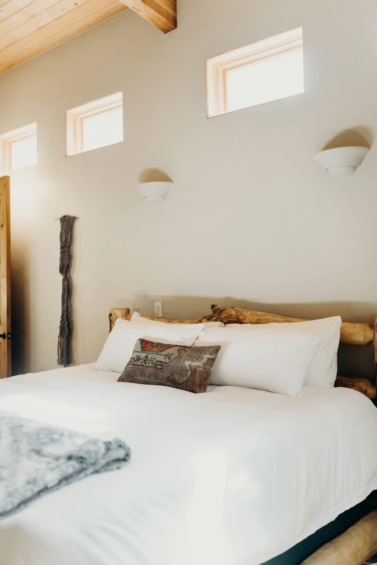 • High ceilings with wooden panels and beams throughout