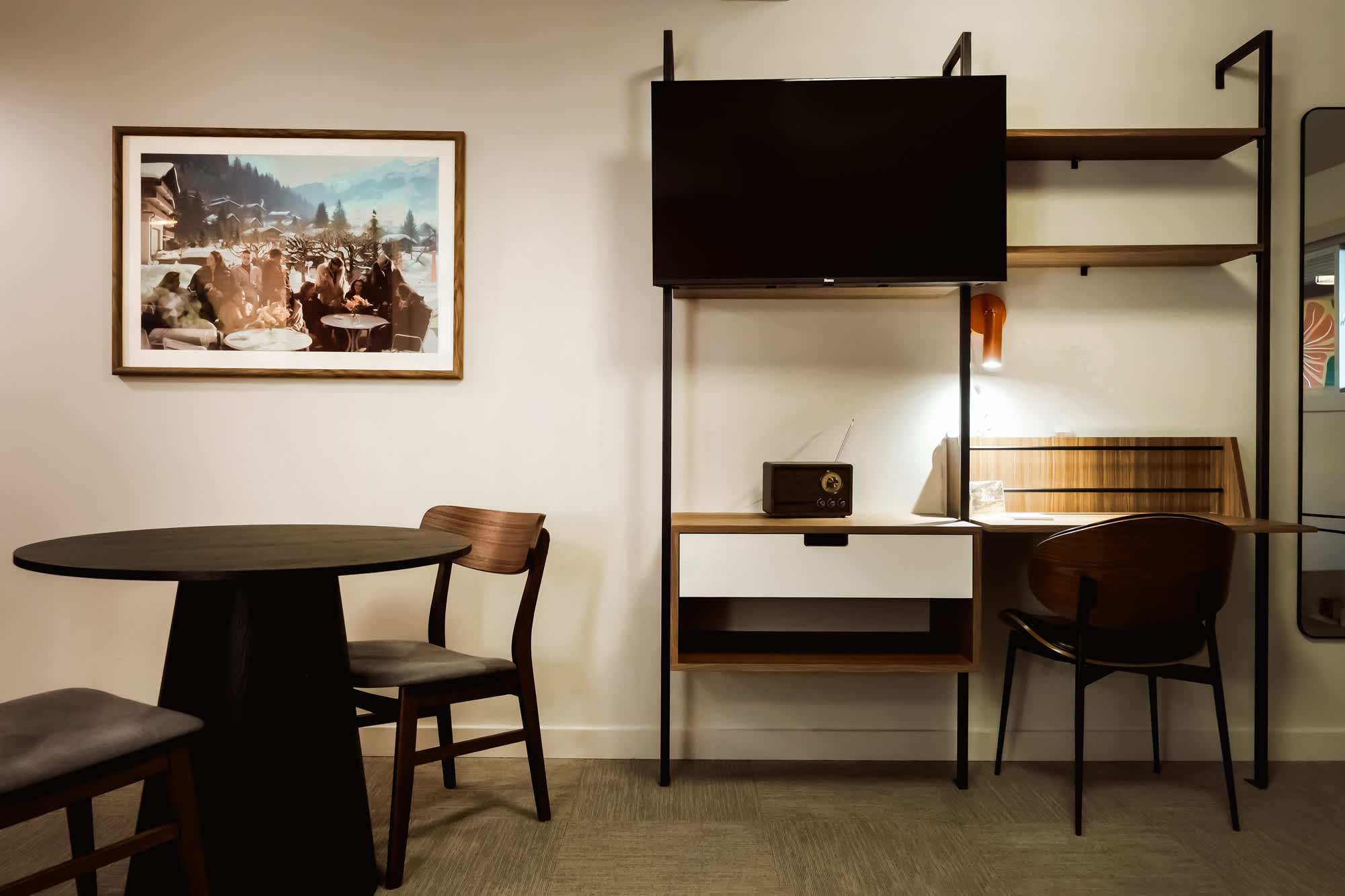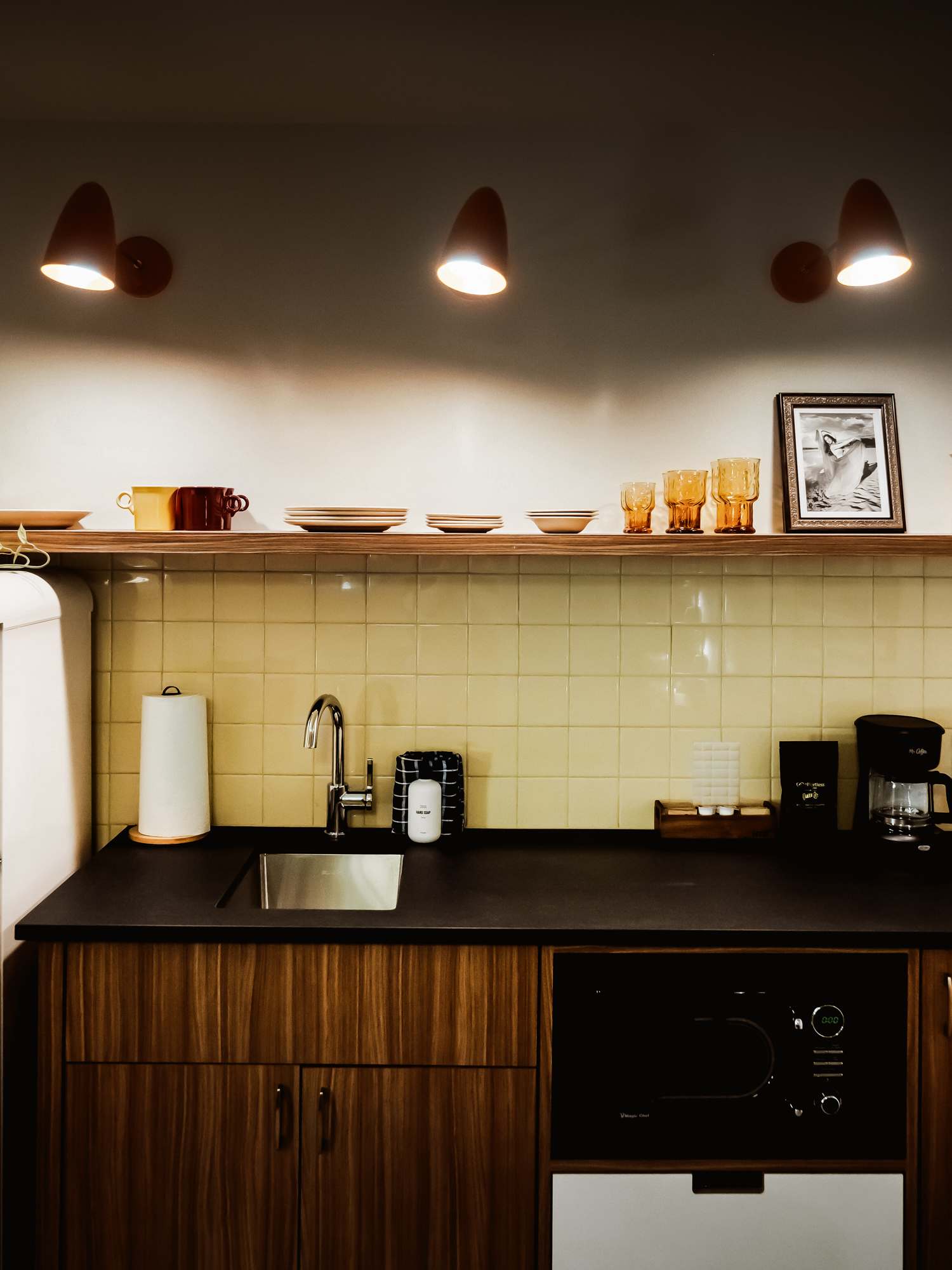 Relax in the plush king bed under a cozy woven blanket (available for purchase) and stream your favorite music on the Bluetooth speaker. With a dedicated workspace, kitchenette, Roku TV, and fast Wi-Fi, it’s easy to balance relaxation and productivity. Each room features its own personality, so wallpaper and color schemes may vary slightly from what’s shown in the photos.