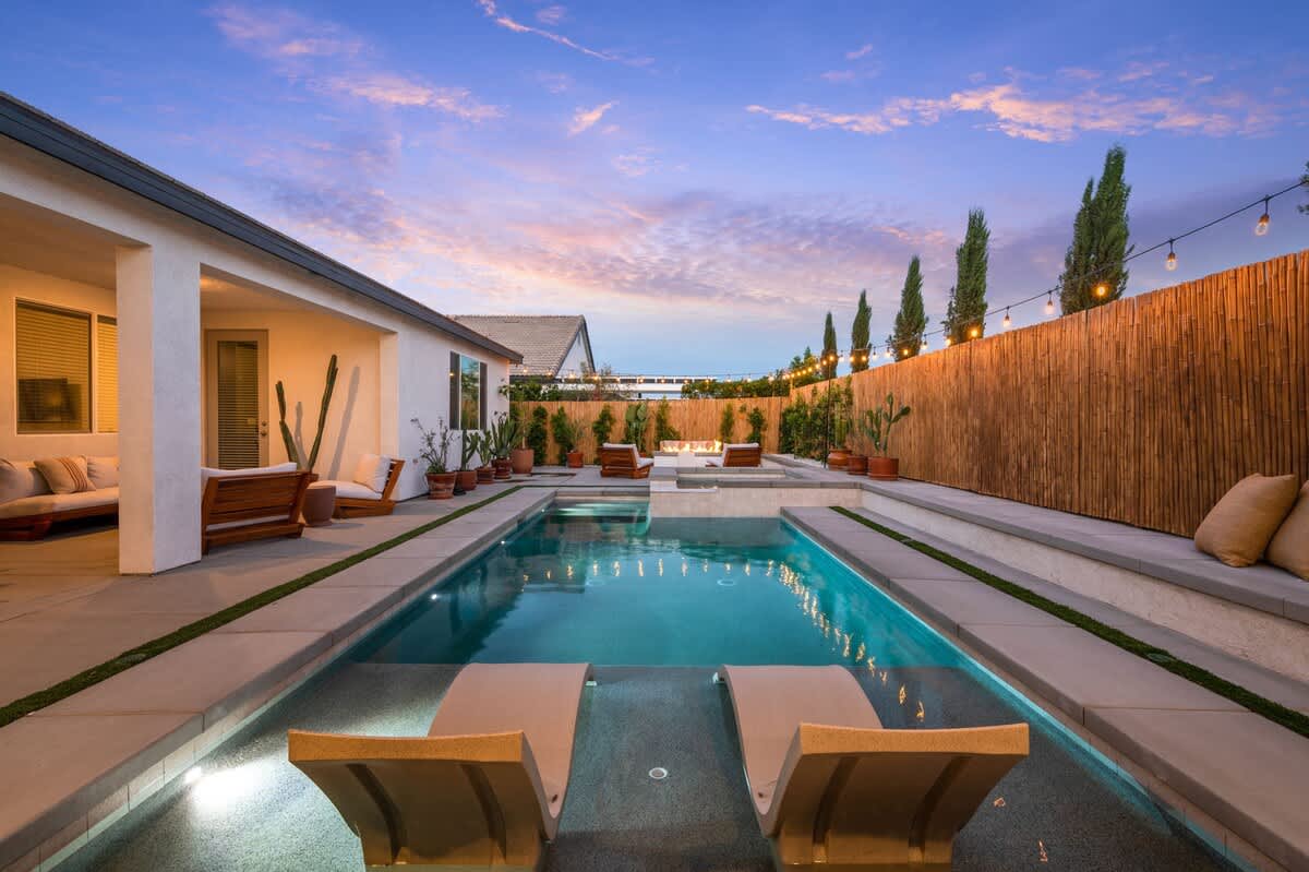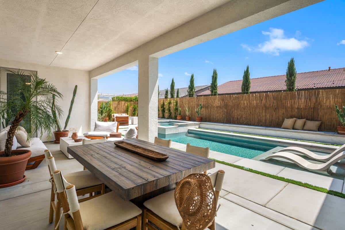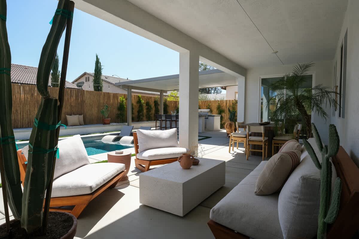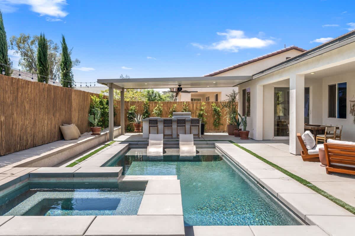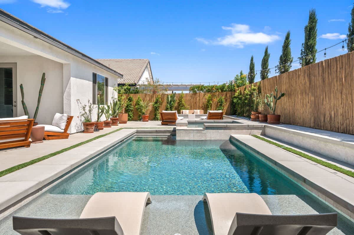 Casa Oaxaca is a peaceful retreat minutes from Coachella and Stagecoach. Newly remodeled and inspired by modern Mexican design, its open-concept kitchen, living, and dining room are made for entertaining. The garden features a brand-new modern pool with a tanning beach and spa, a shaded outdoor kitchen with built-in grill and bar seating, a fire pit, hotel lounge seating, a rustic banquet table, and bistro lights. Bamboo privacy fencing, ficus, and olive trees create an intimate setting for gatherings.