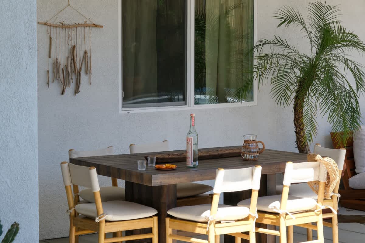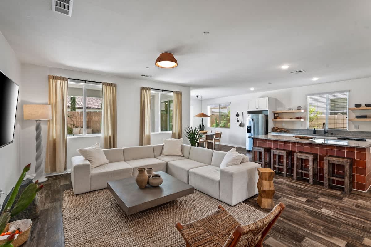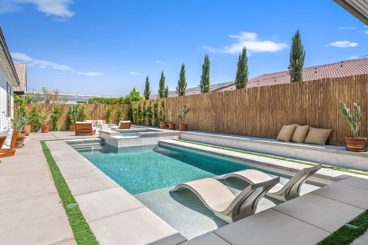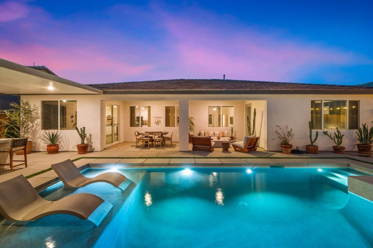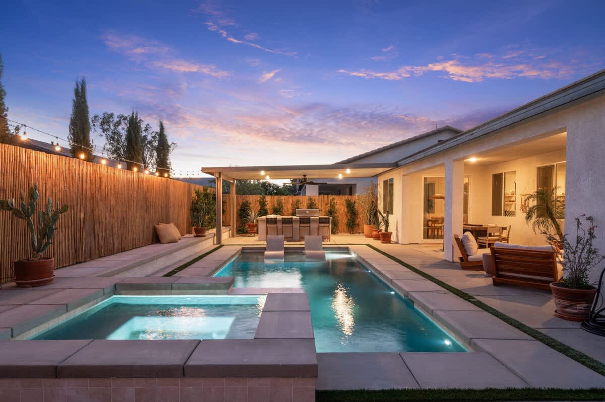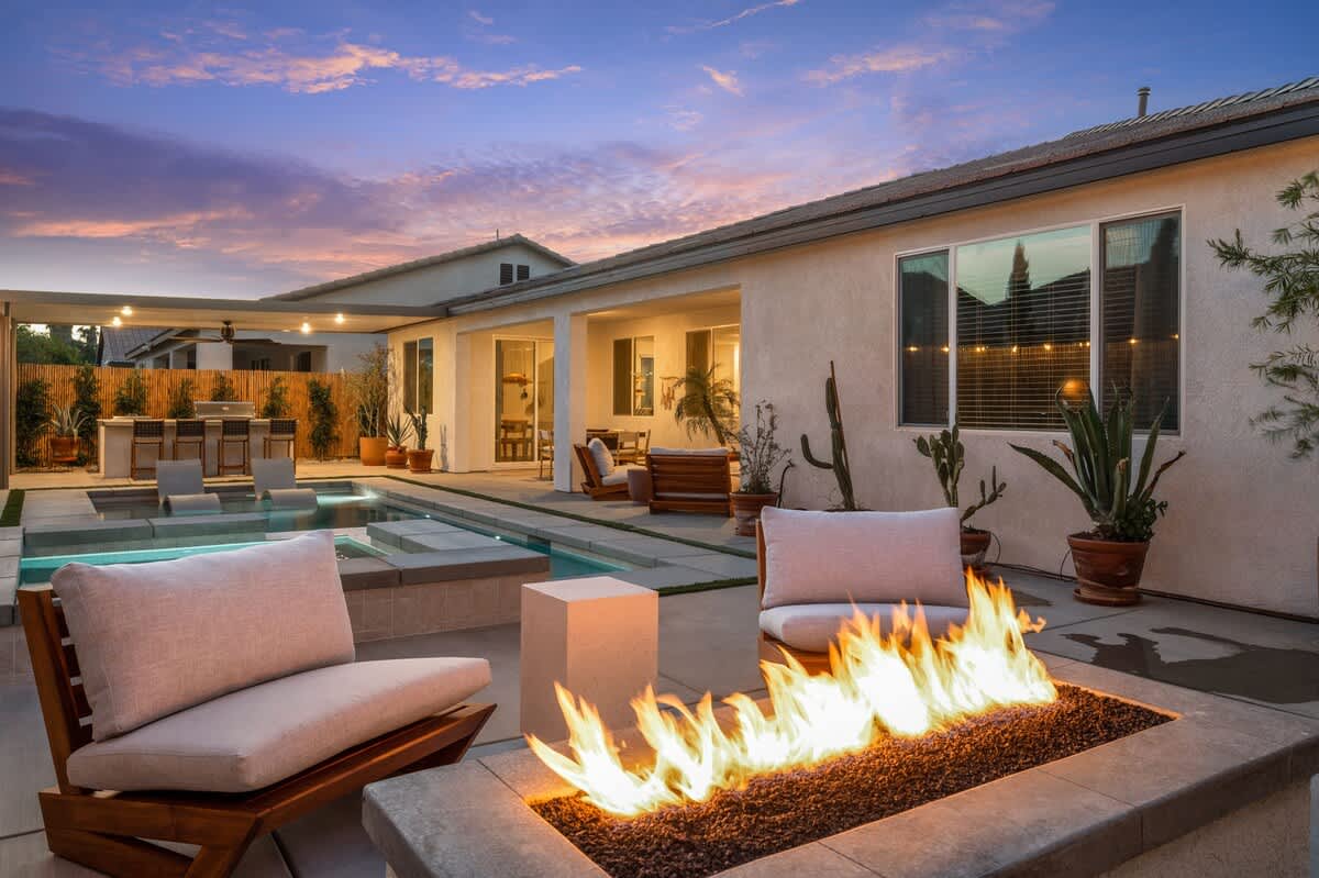 Casa Oaxaca is a peaceful retreat minutes from Coachella and Stagecoach. Newly remodeled and inspired by modern Mexican design, its open-concept kitchen, living, and dining room are made for entertaining. The garden features a brand-new modern pool with a tanning beach and spa, a shaded outdoor kitchen with built-in grill and bar seating, a fire pit, hotel lounge seating, a rustic banquet table, and bistro lights. Bamboo privacy fencing, ficus, and olive trees create an intimate setting for gatherings.