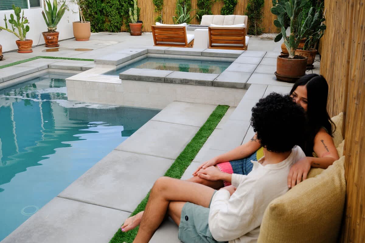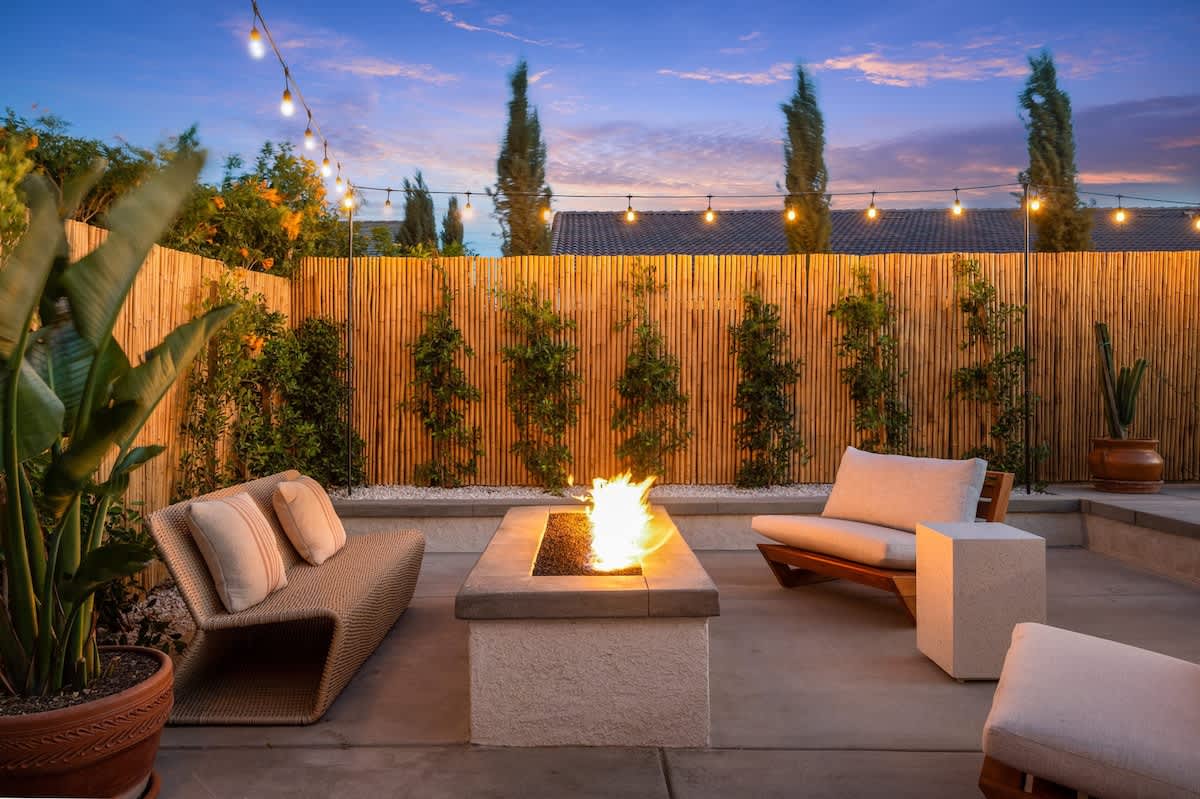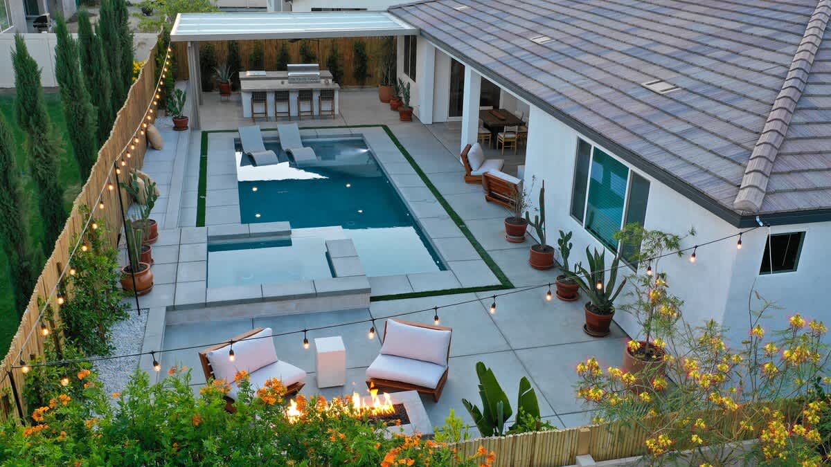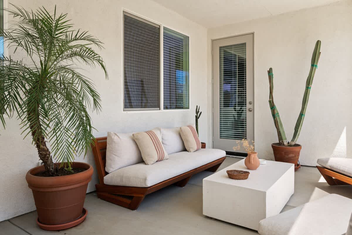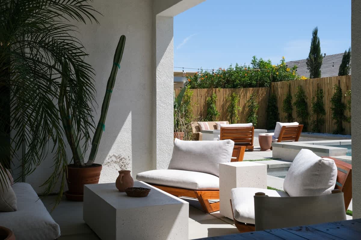 Casa Oaxaca is a peaceful retreat minutes from Coachella and Stagecoach. Newly remodeled and inspired by modern Mexican design, its open-concept kitchen, living, and dining room are made for entertaining. The garden features a brand-new modern pool with a tanning beach and spa, a shaded outdoor kitchen with built-in grill and bar seating, a fire pit, hotel lounge seating, a rustic banquet table, and bistro lights. Bamboo privacy fencing, ficus, and olive trees create an intimate setting for gatherings.