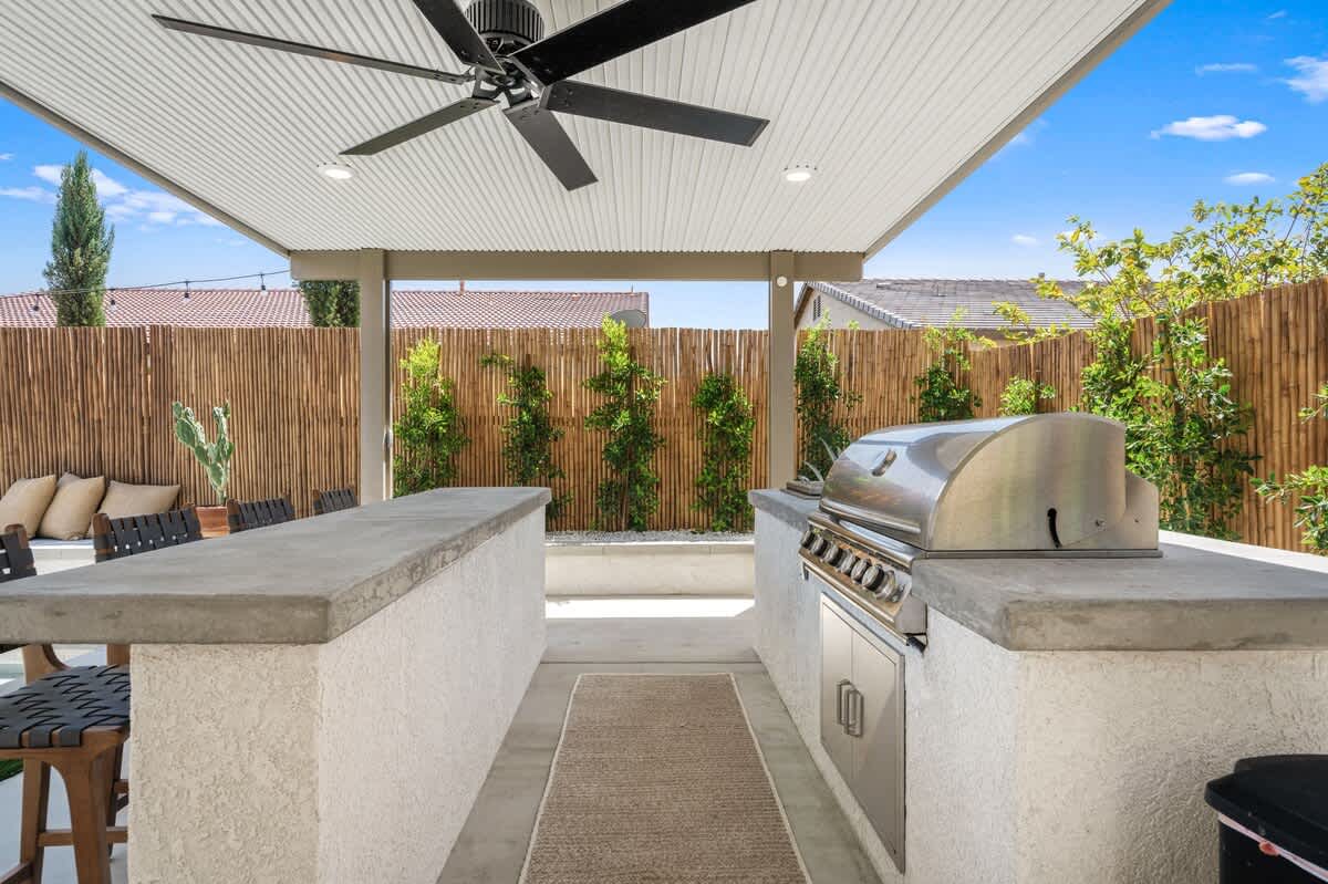 • Outdoor kitchen and pergola: brand new outdoor kitchen features two countertop bars, one with seating for 4 and the second with built-in 6-burner gas grill and 3-day ice chest. The entire area is shaded by a pergola with a ceiling fan, dimmable recessed lighting, and a number of power outlets.