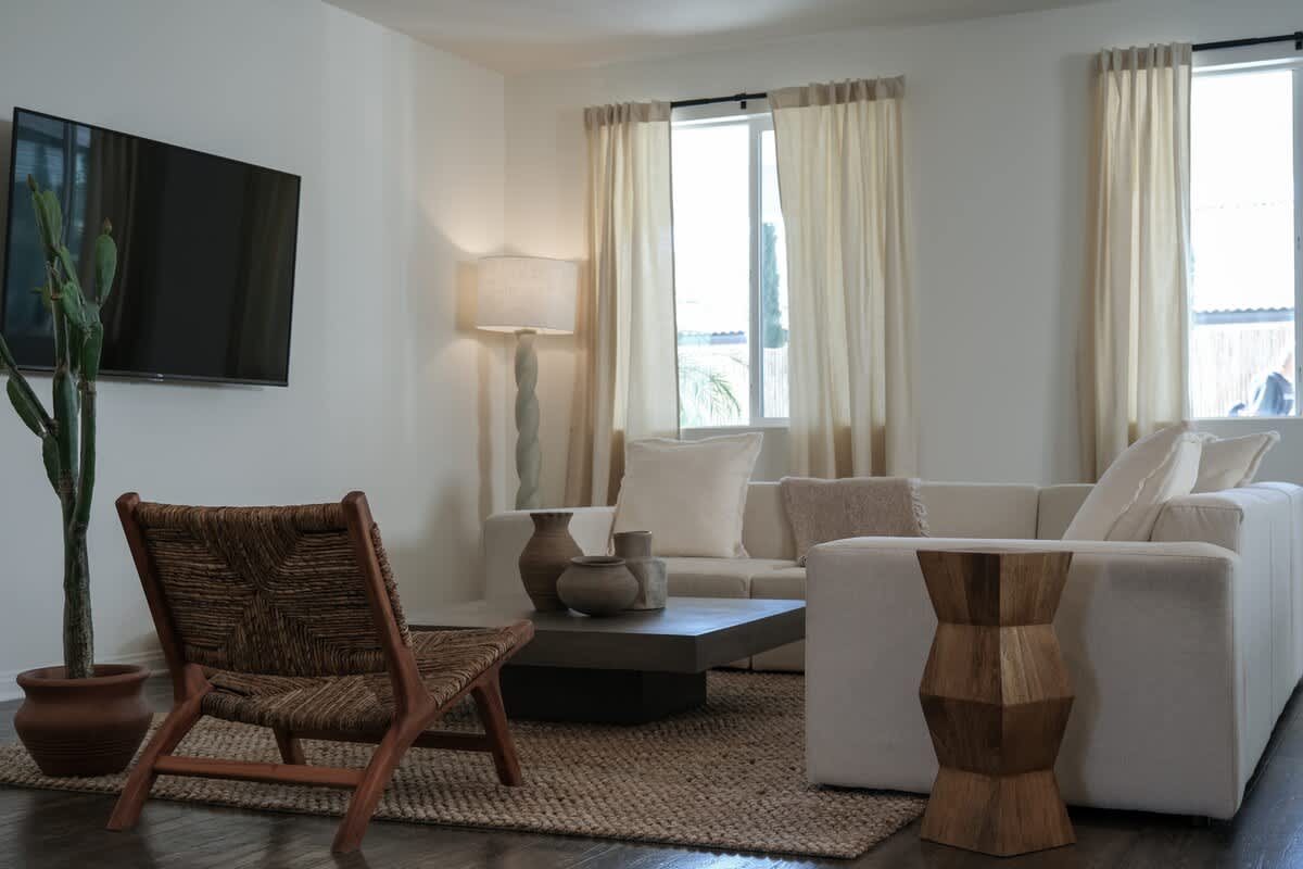 • Living room: large plush sofa and wicker lounge chair with seating for 10. Coffee and side tables, large smart TV, custom lighting.