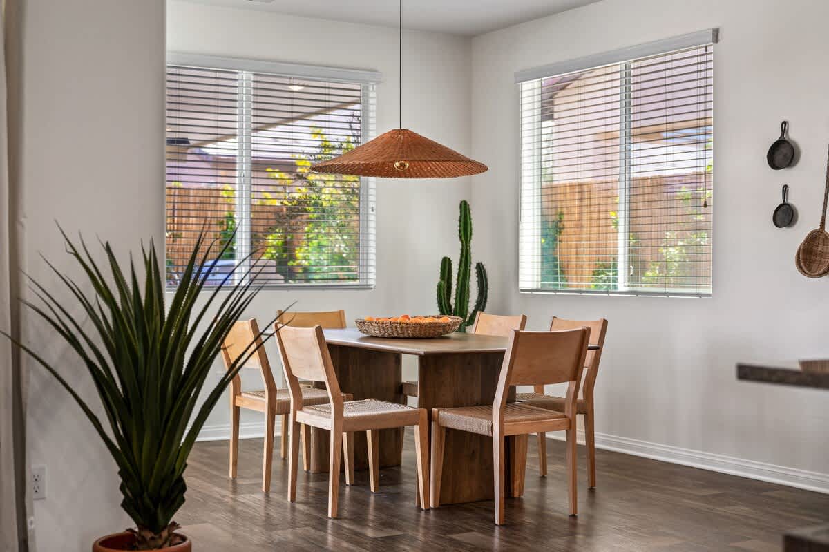 • Dining room: long banquet-style table with seating for 8, soft adjustable lighting for cozy meals