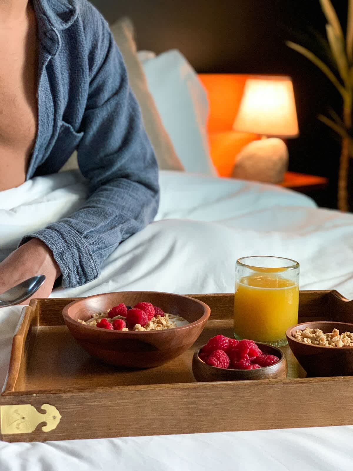 • Bedroom 1 (primary): King bed with built-in nightstands, ensuite bathroom, table lamps, designated workspace, yoga space, walk-in closet, luggage racks, smart TV, private pool access, ceiling fan
