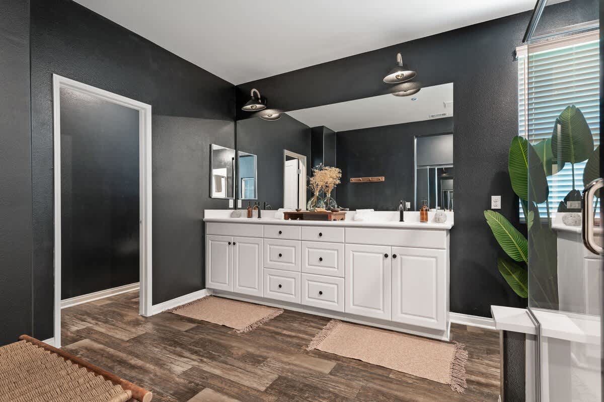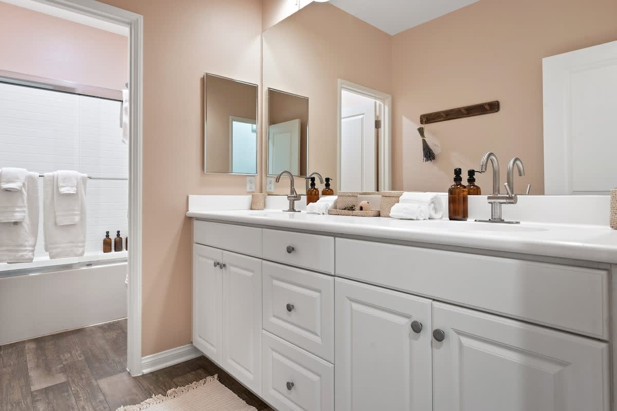 • Bathroom 2: full bath with shower, bathtub, water closet, dual sinks, and medicine cabinets