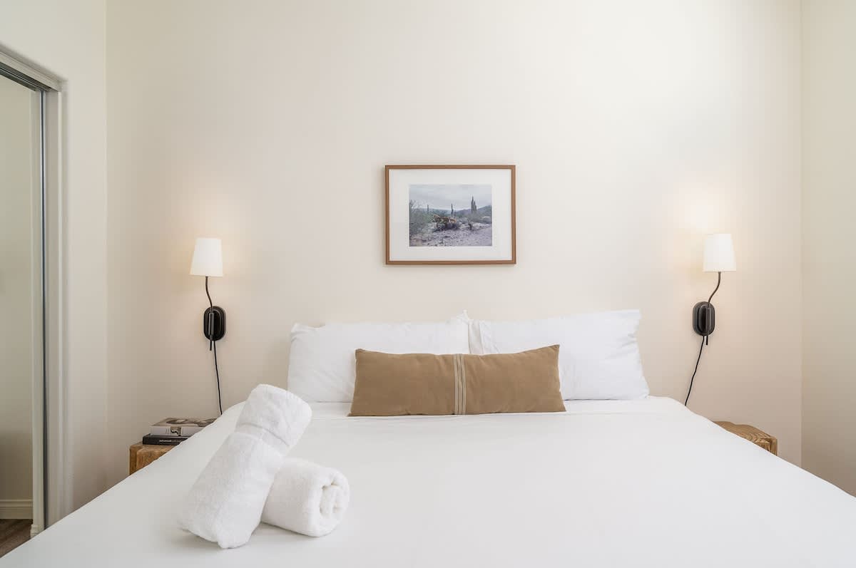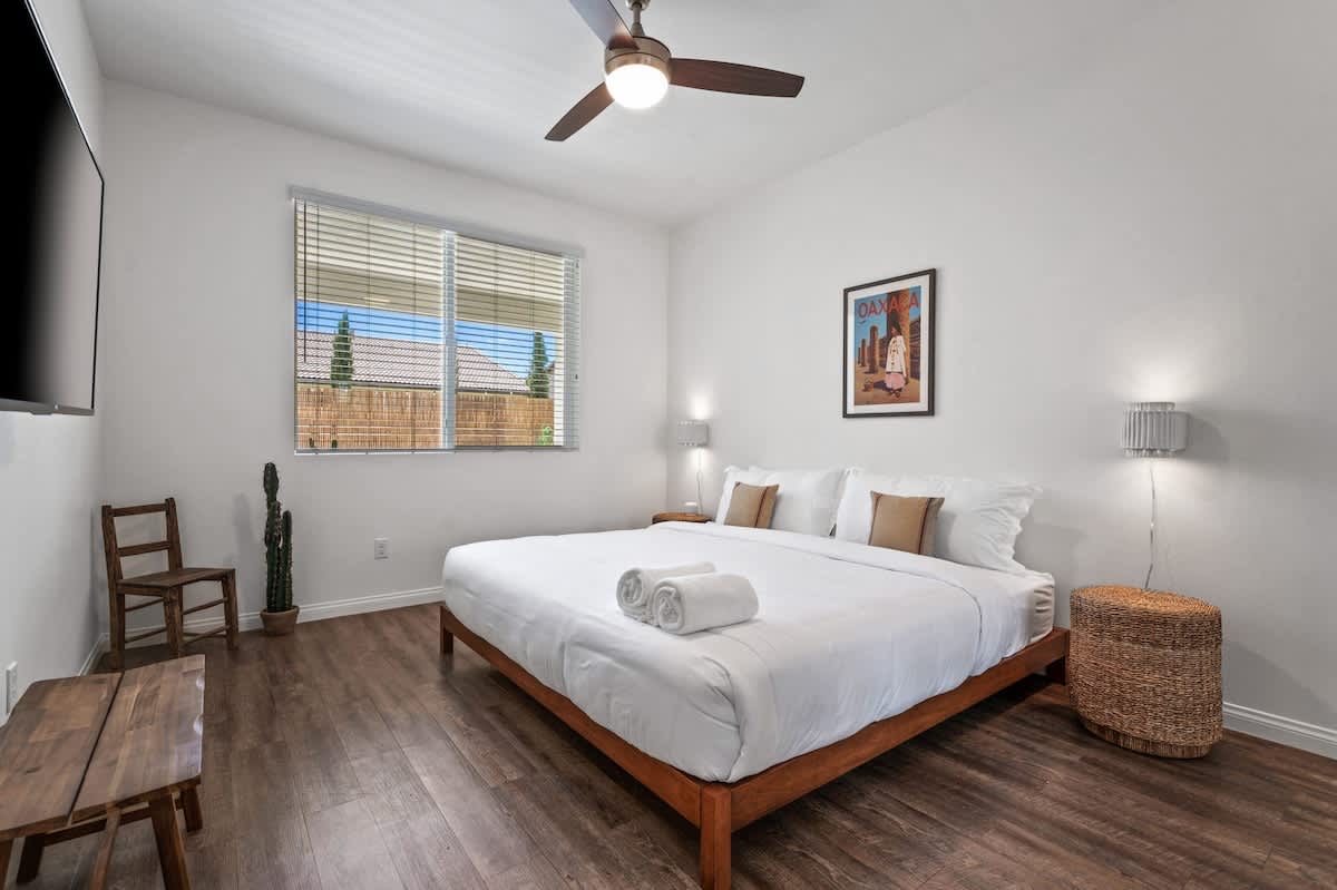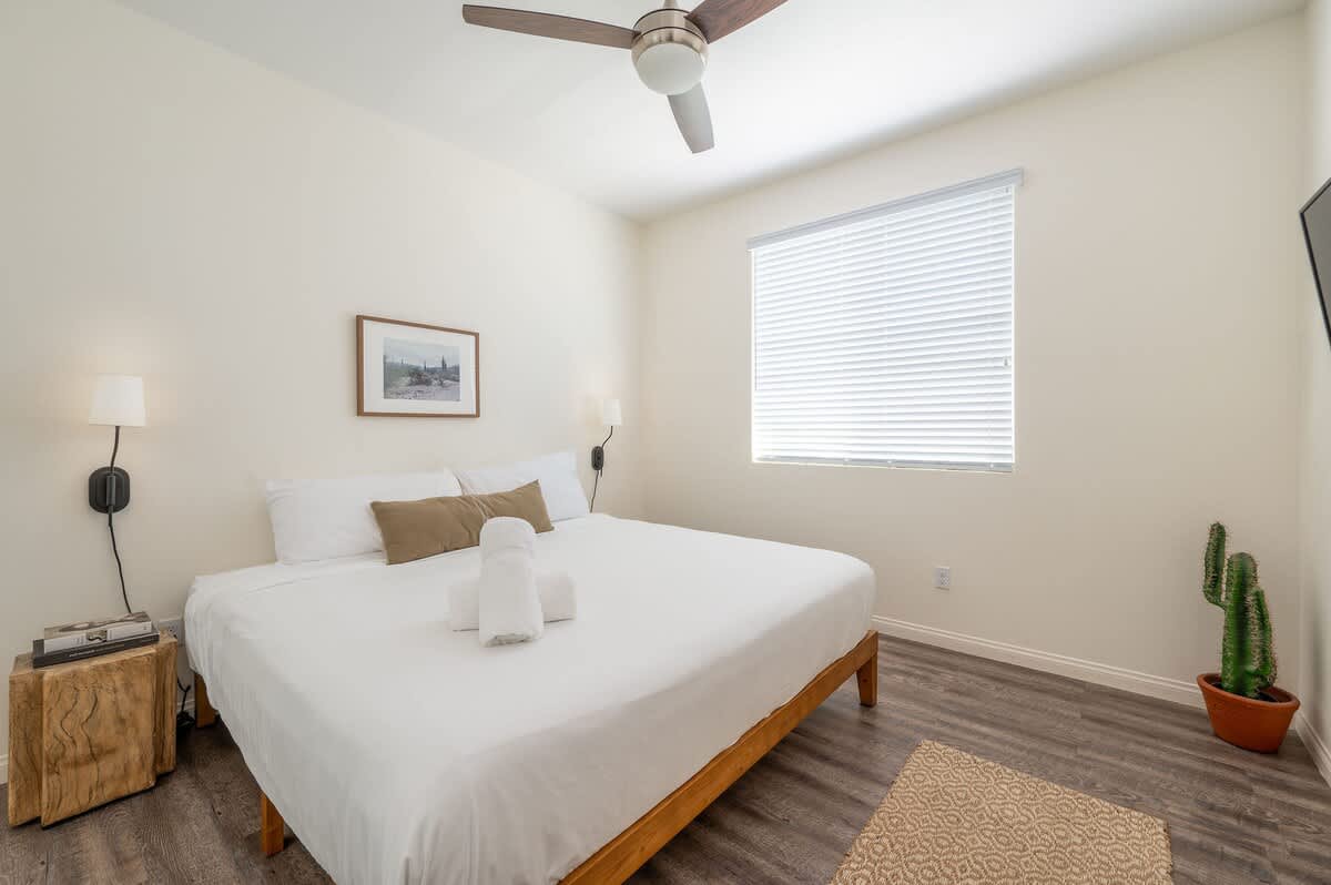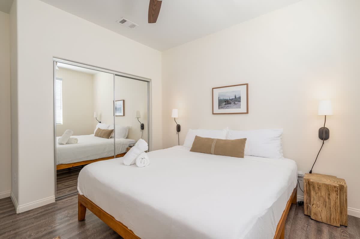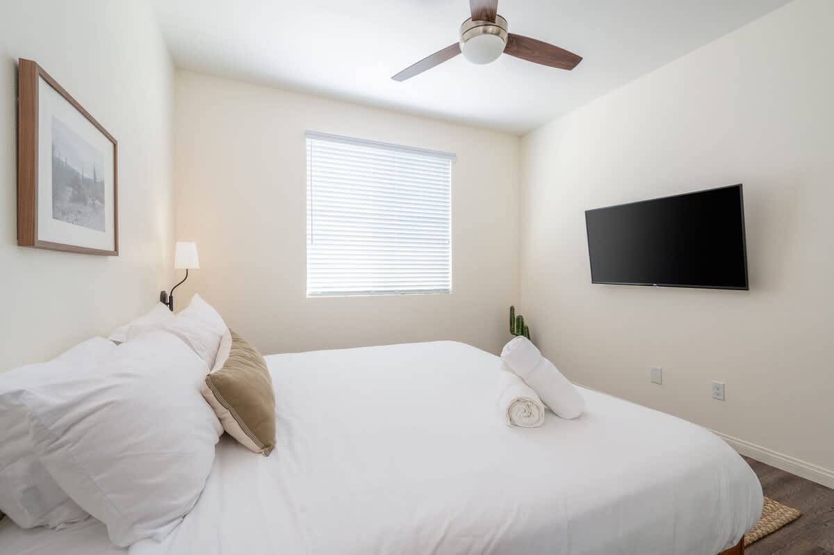 • Bedroom 2: King bed, bedside tables, sconces, smart TV, closet, luggage rack, ceiling fan
