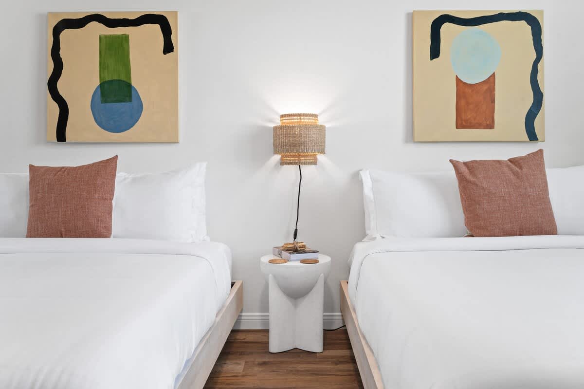 • Bedroom 5: 2 queen beds, bedside table, sconce, smart TV, closet, luggage rack, ceiling fan