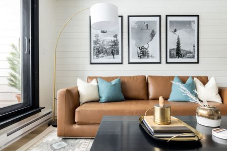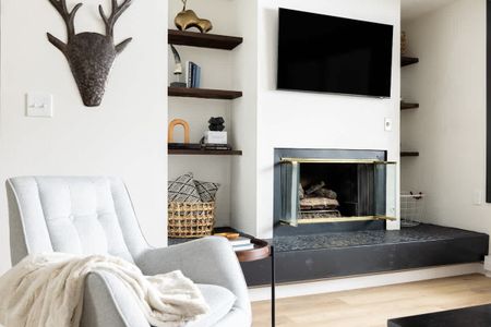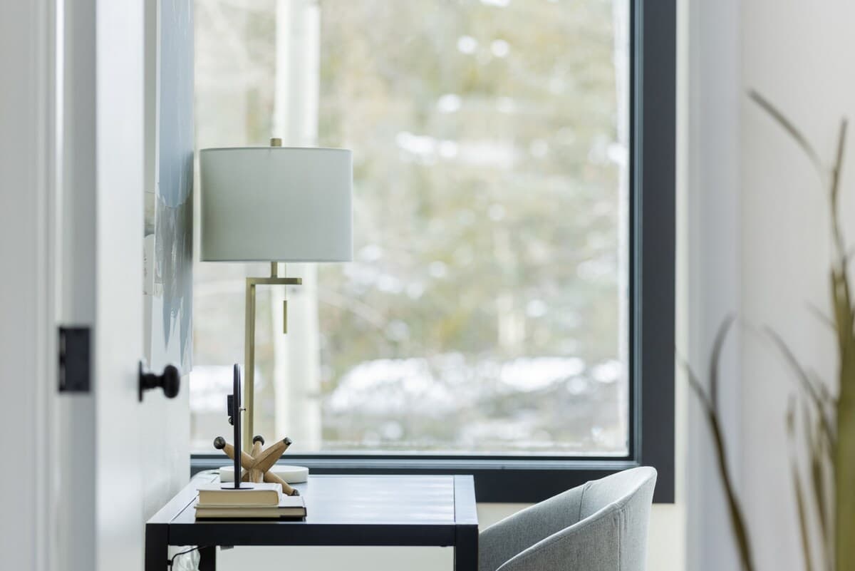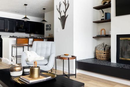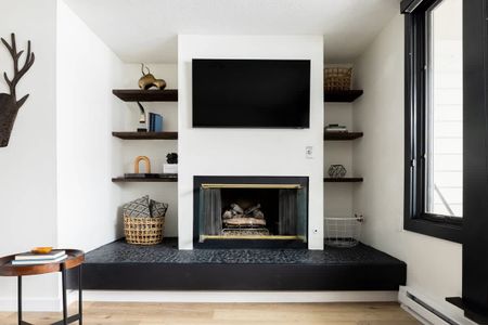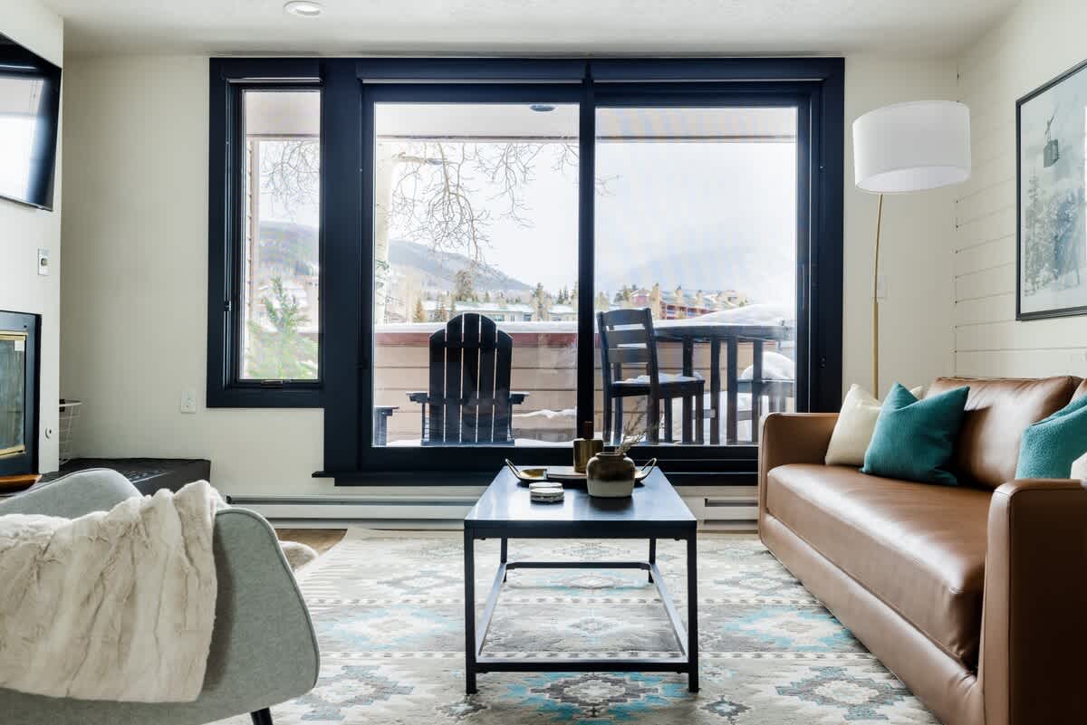 • Living area with floor-to-ceiling windows and a gas fireplace