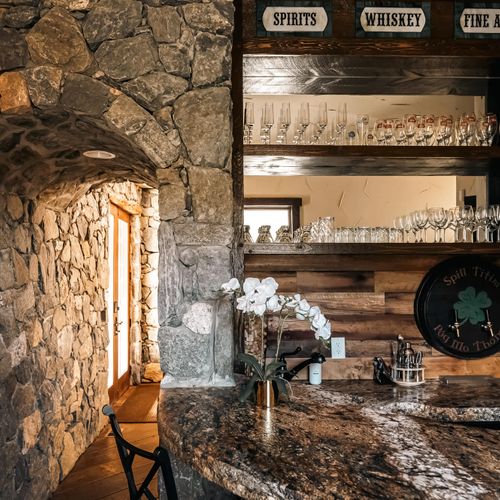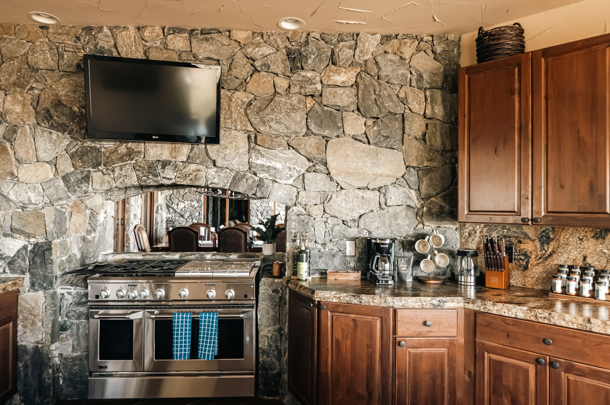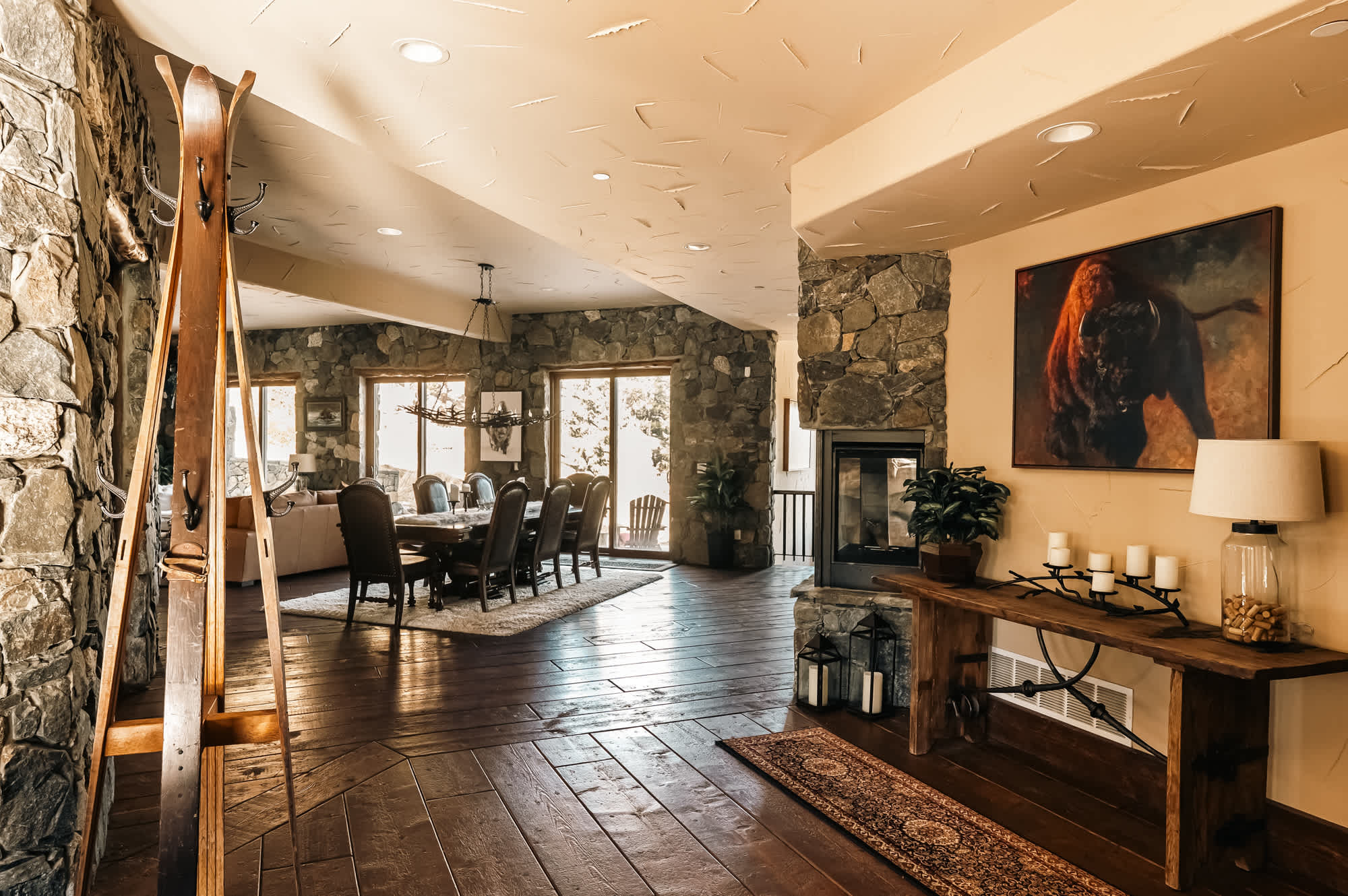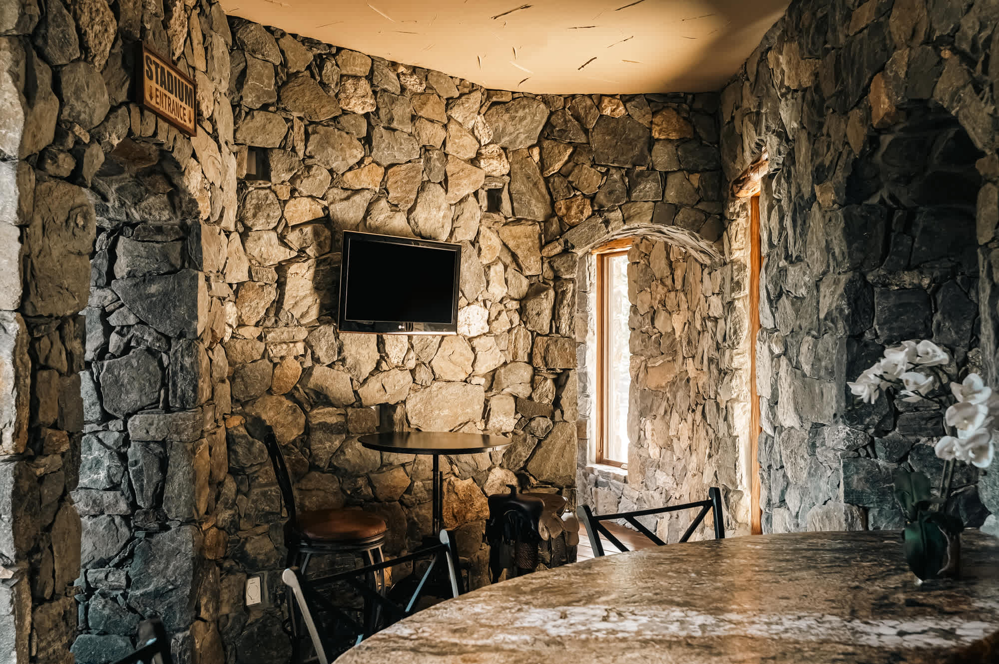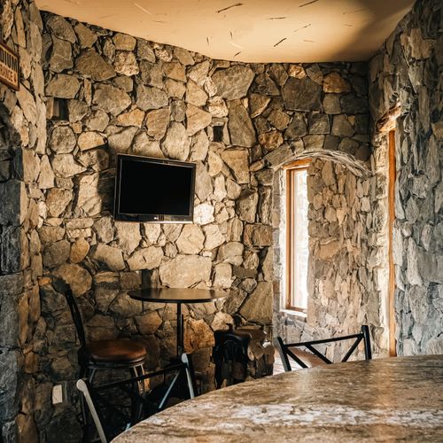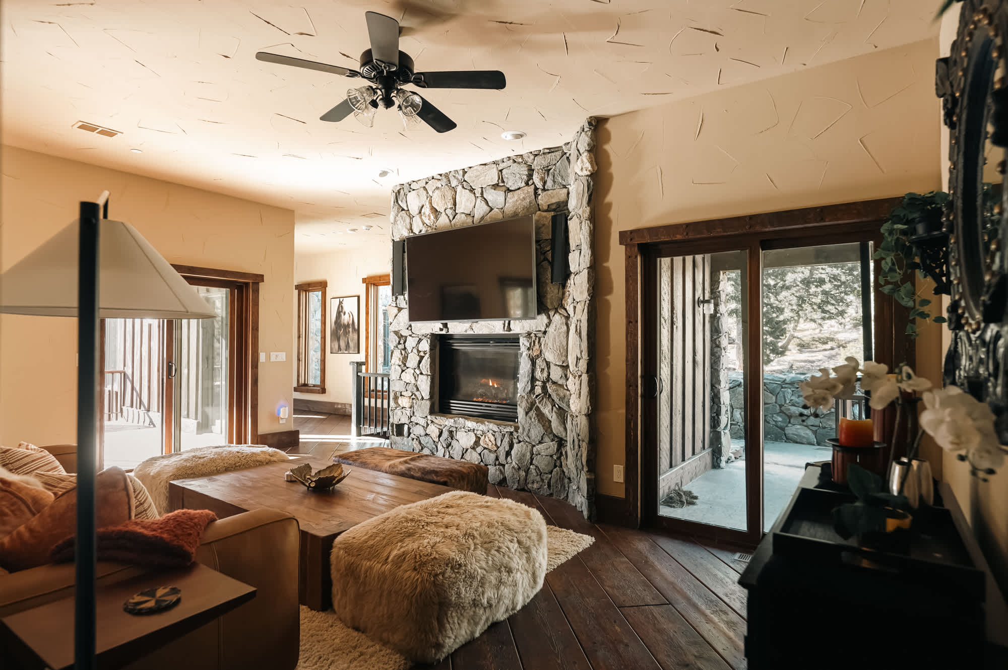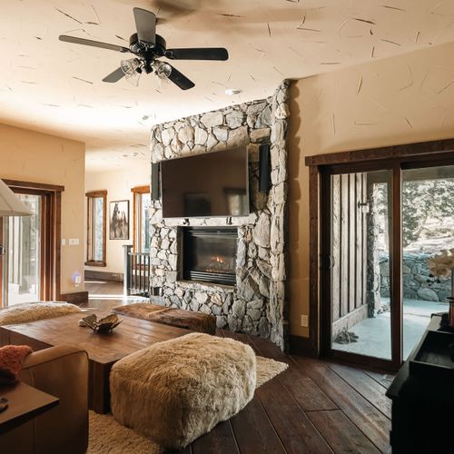 Entering through a rock archway entrance on the upper driveway, you’ll immediately understand why this home earned its name. You’ll pass a moat-style water feature that flows into a small waterfall near the parking area (springtime caution note: local bears occasionally stop by for a shower - nature at its finest), as well as a covered outdoor seating area near the entry, followed by a warm, welcoming first impression that sets the tone for the entire stay once inside.