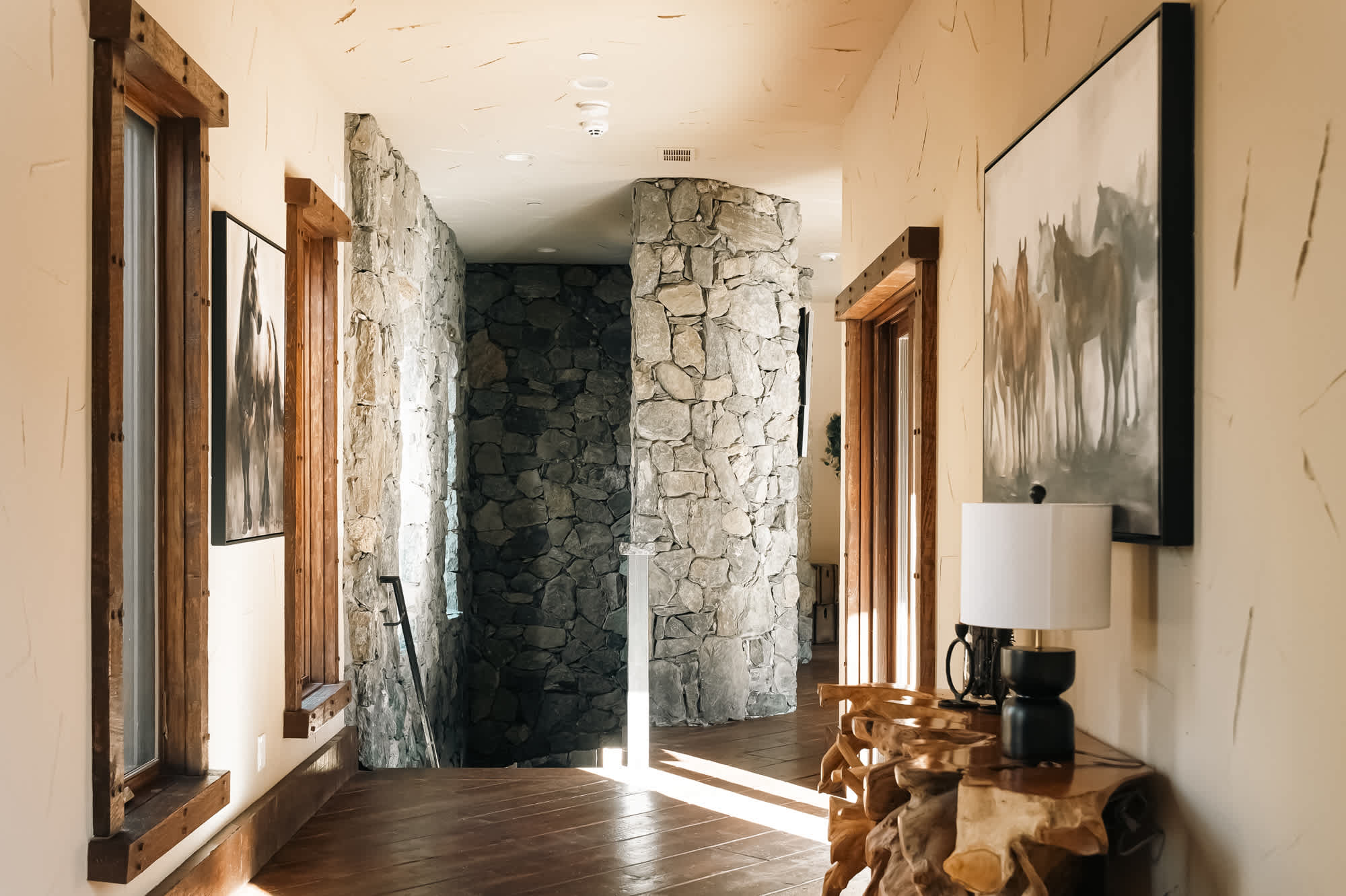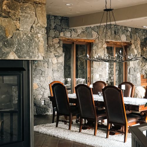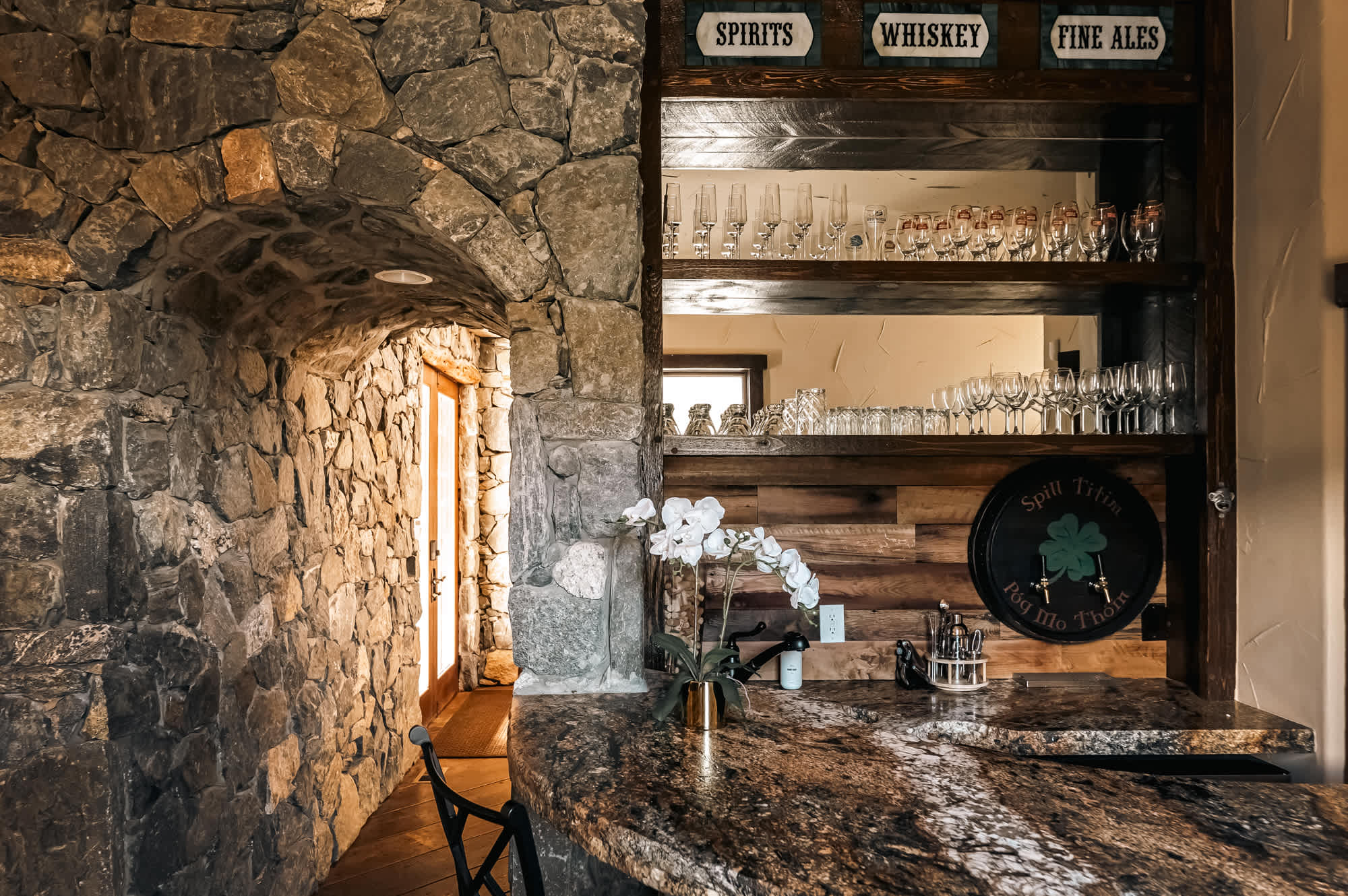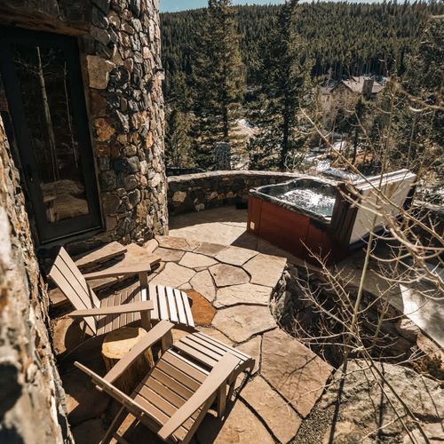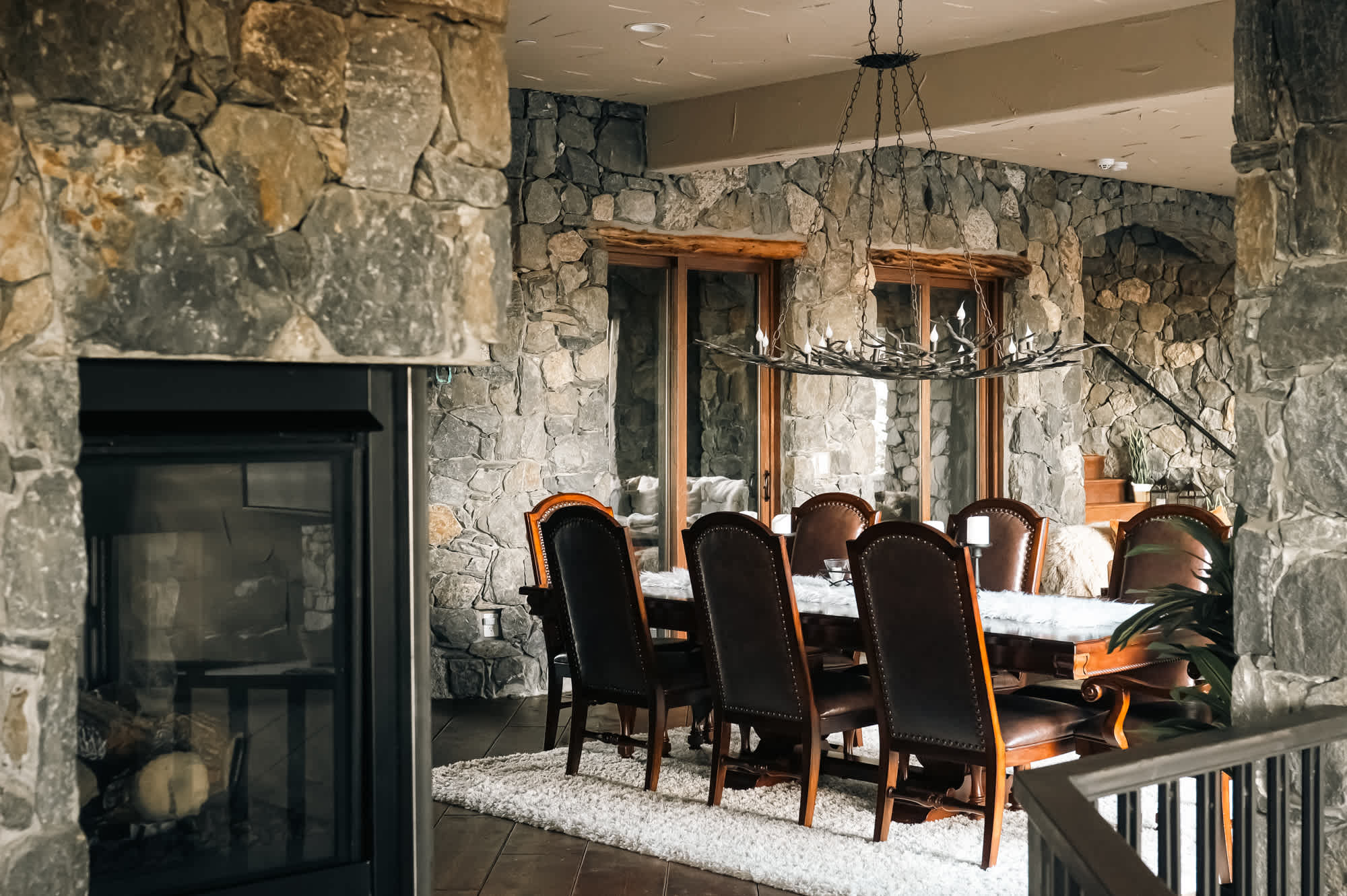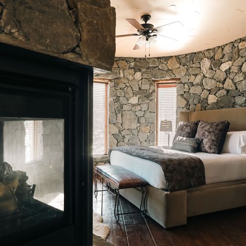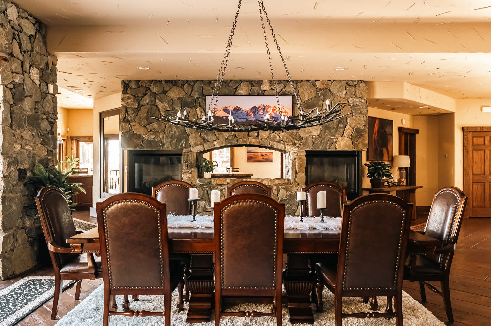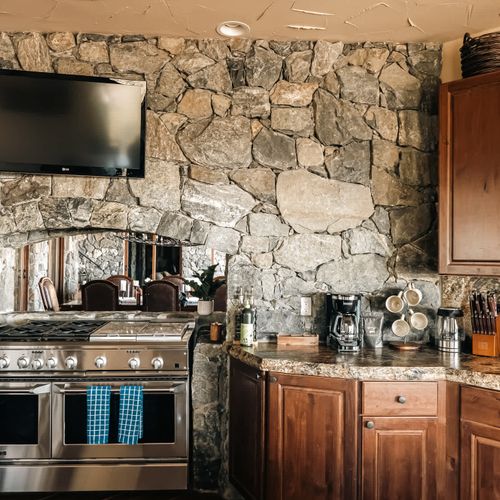 Entering through a rock archway entrance on the upper driveway, you’ll immediately understand why this home earned its name. You’ll pass a moat-style water feature that flows into a small waterfall near the parking area (springtime caution note: local bears occasionally stop by for a shower - nature at its finest), as well as a covered outdoor seating area near the entry, followed by a warm, welcoming first impression that sets the tone for the entire stay once inside.