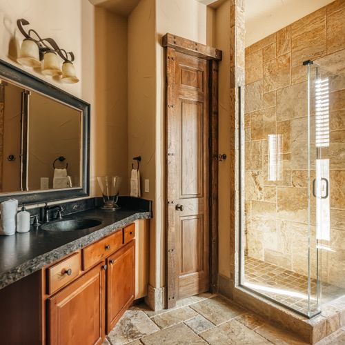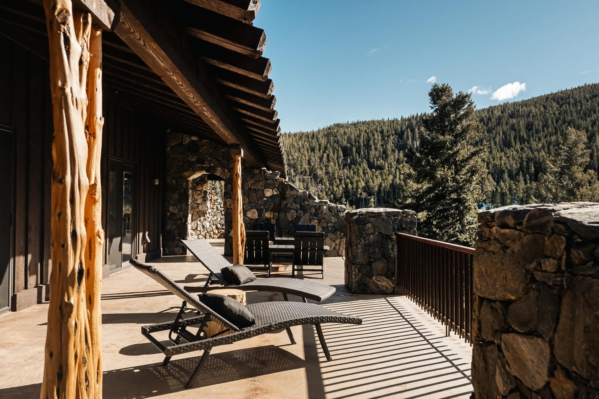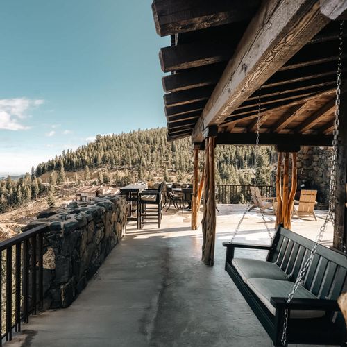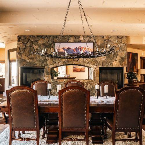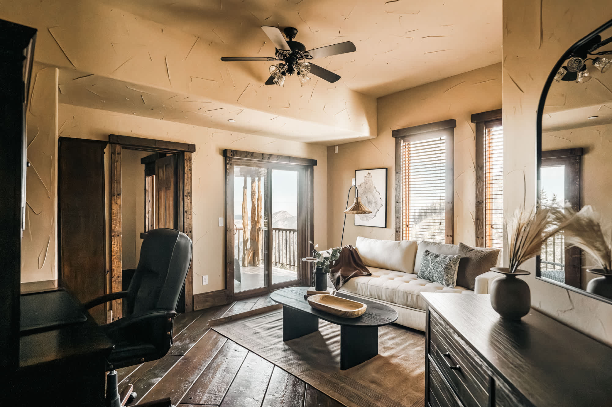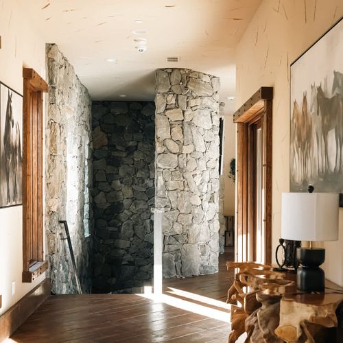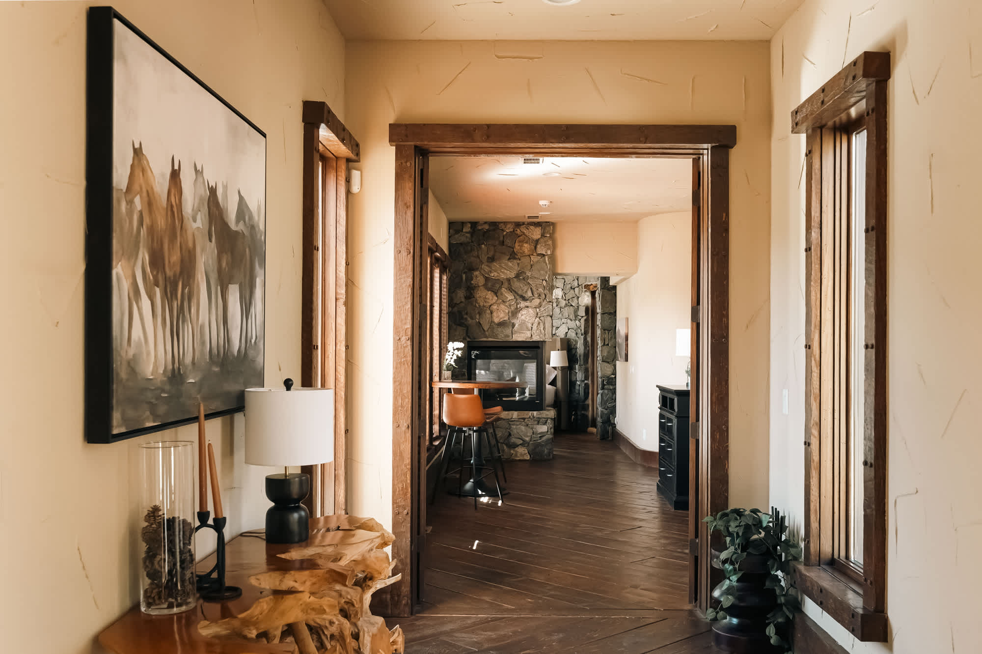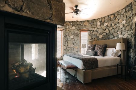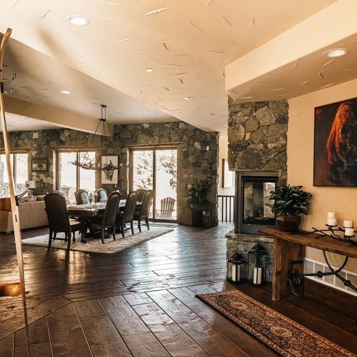 Entering through a rock archway entrance on the upper driveway, you’ll immediately understand why this home earned its name. You’ll pass a moat-style water feature that flows into a small waterfall near the parking area (springtime caution note: local bears occasionally stop by for a shower - nature at its finest), as well as a covered outdoor seating area near the entry, followed by a warm, welcoming first impression that sets the tone for the entire stay once inside.