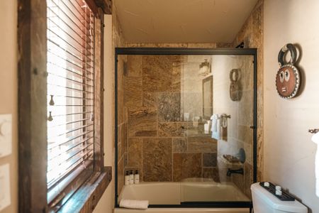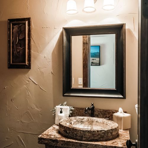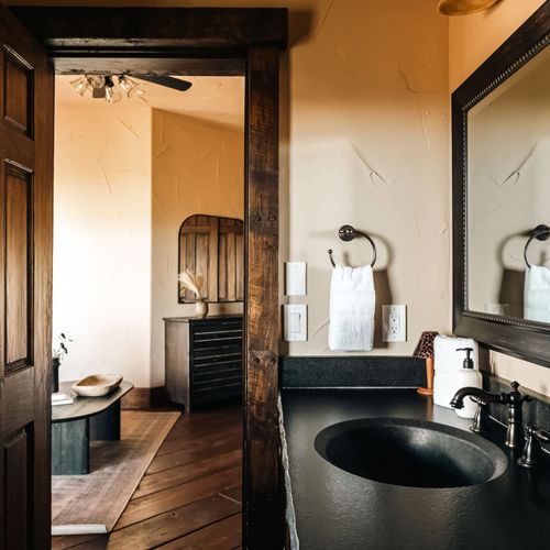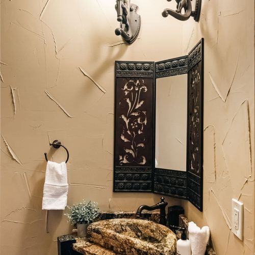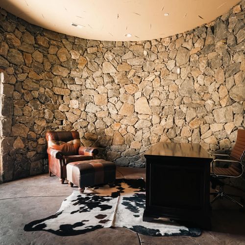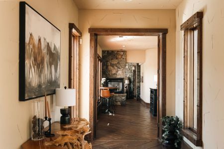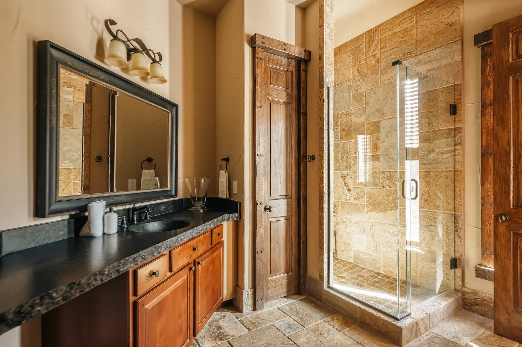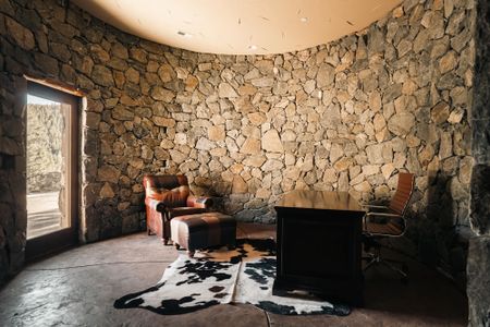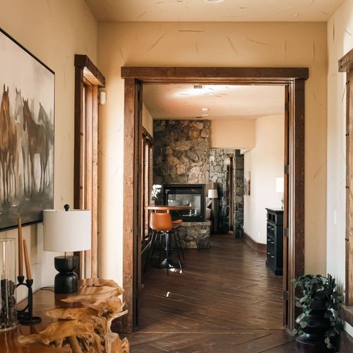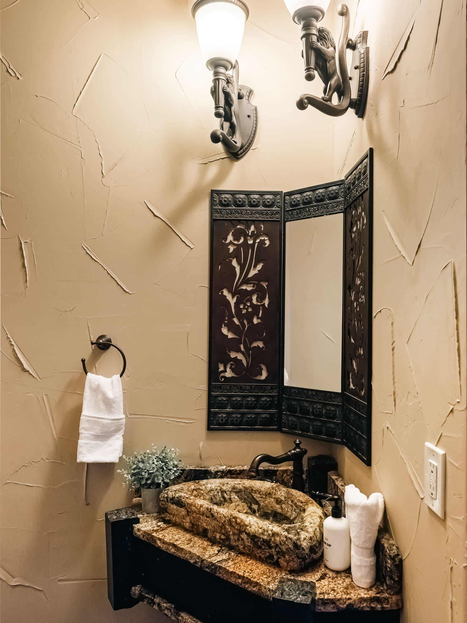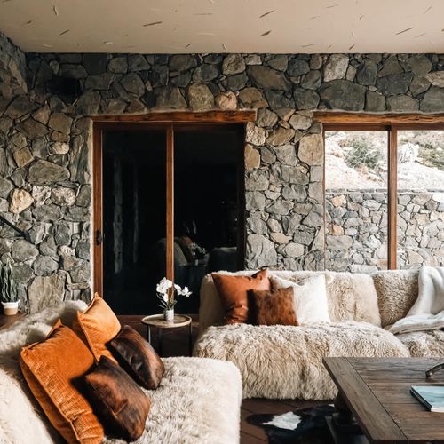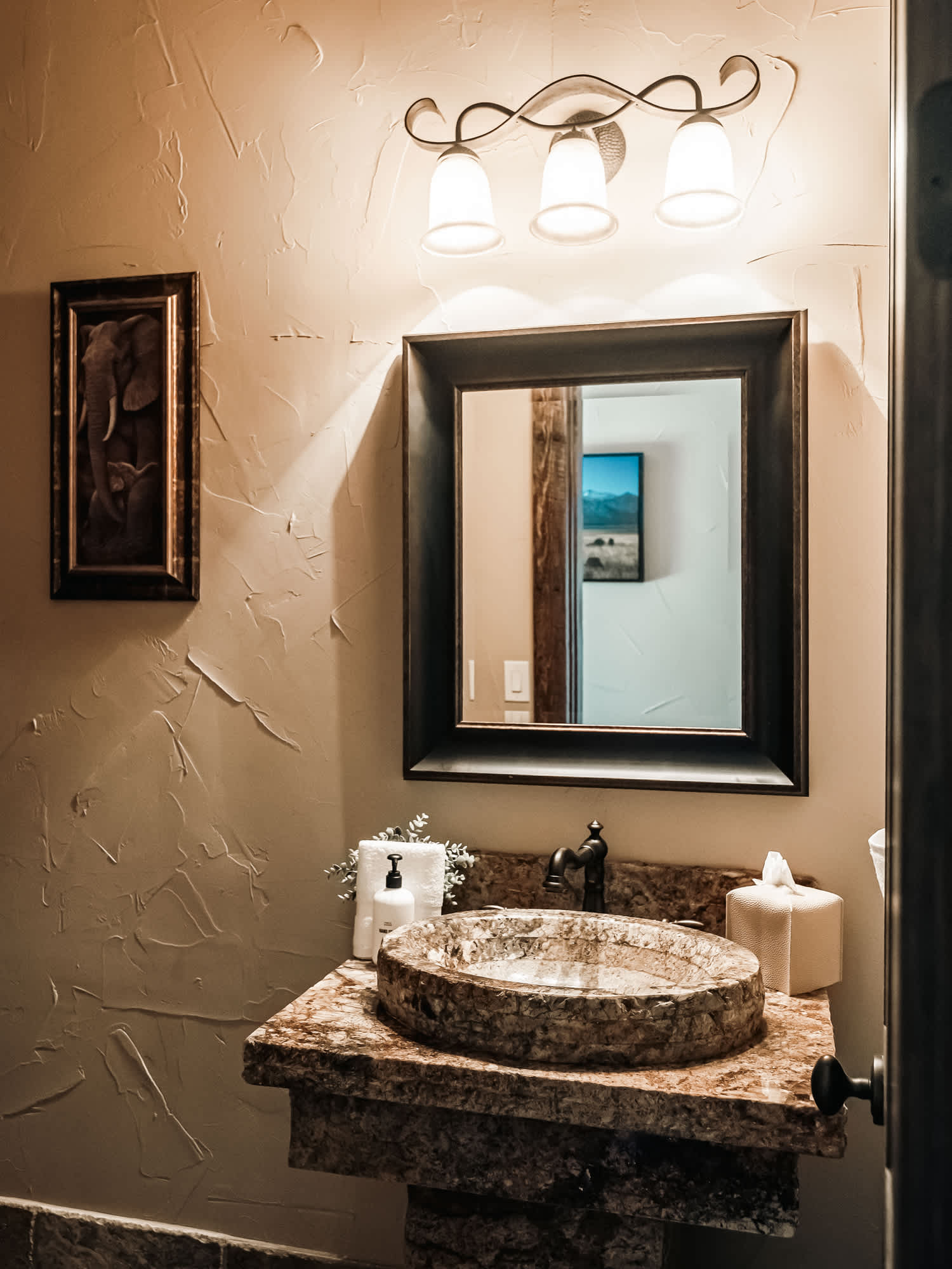Entering through a rock archway entrance on the upper driveway, you’ll immediately understand why this home earned its name. You’ll pass a moat-style water feature that flows into a small waterfall near the parking area (springtime caution note: local bears occasionally stop by for a shower - nature at its finest), as well as a covered outdoor seating area near the entry, followed by a warm, welcoming first impression that sets the tone for the entire stay once inside.
