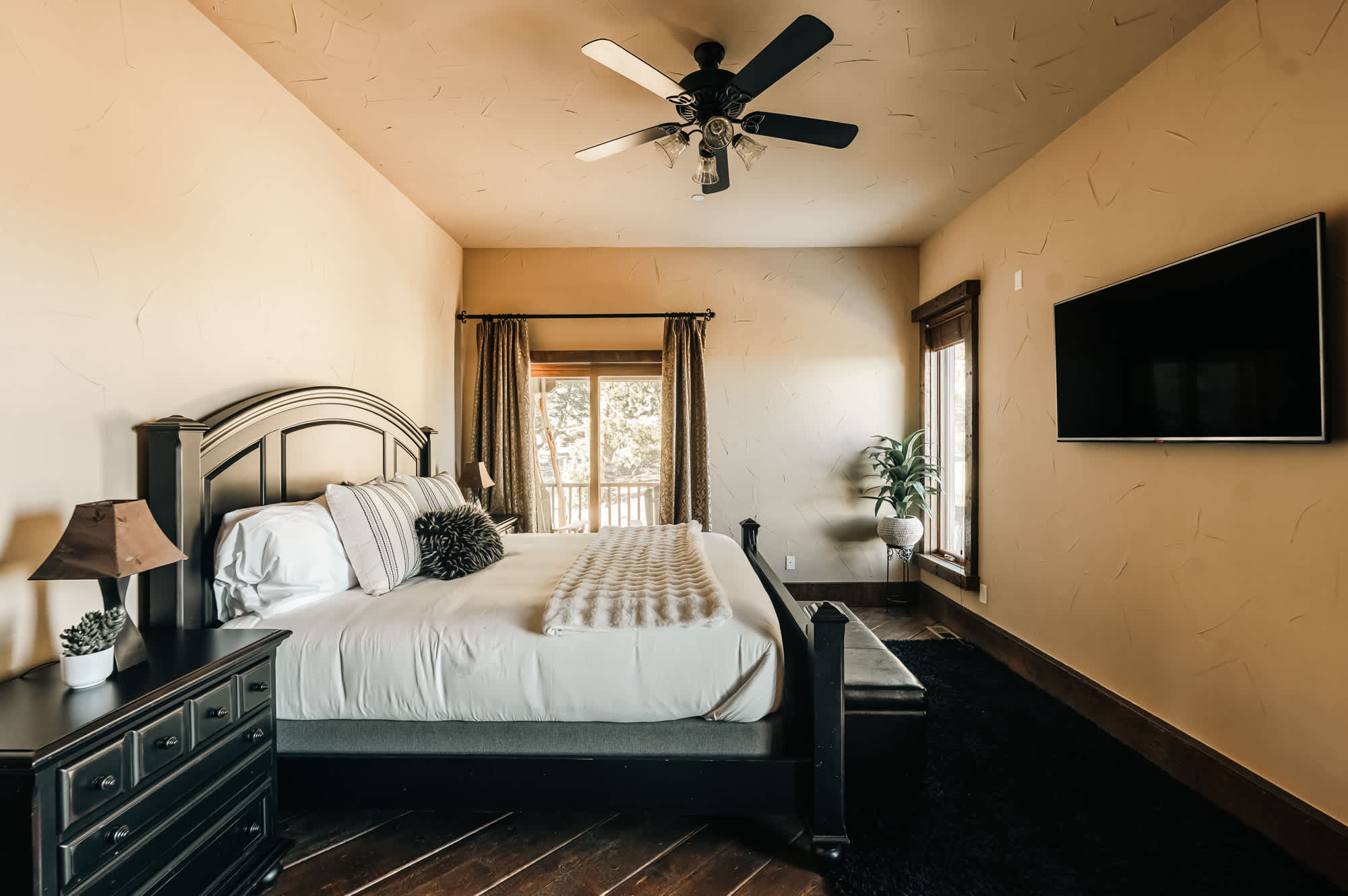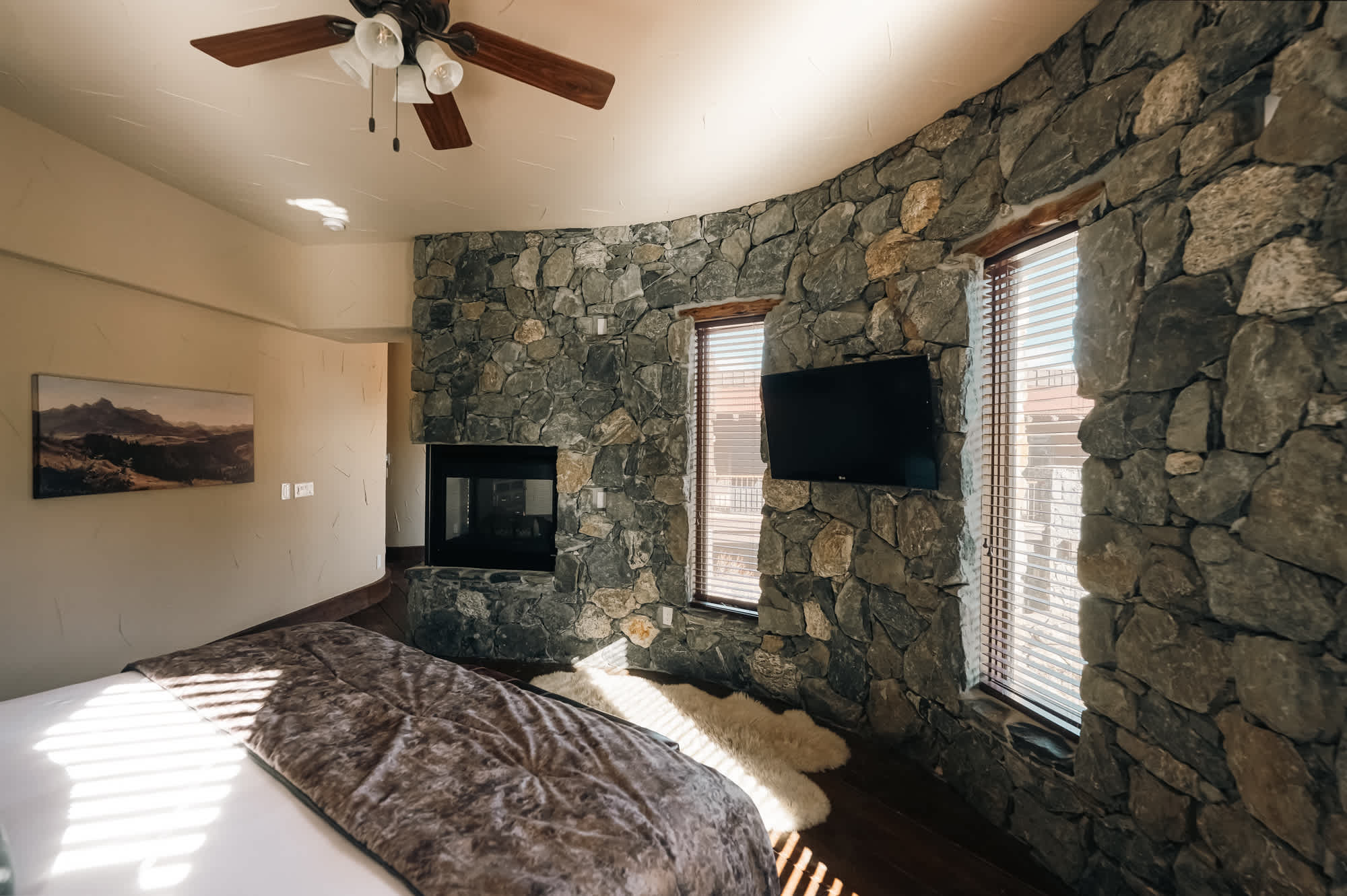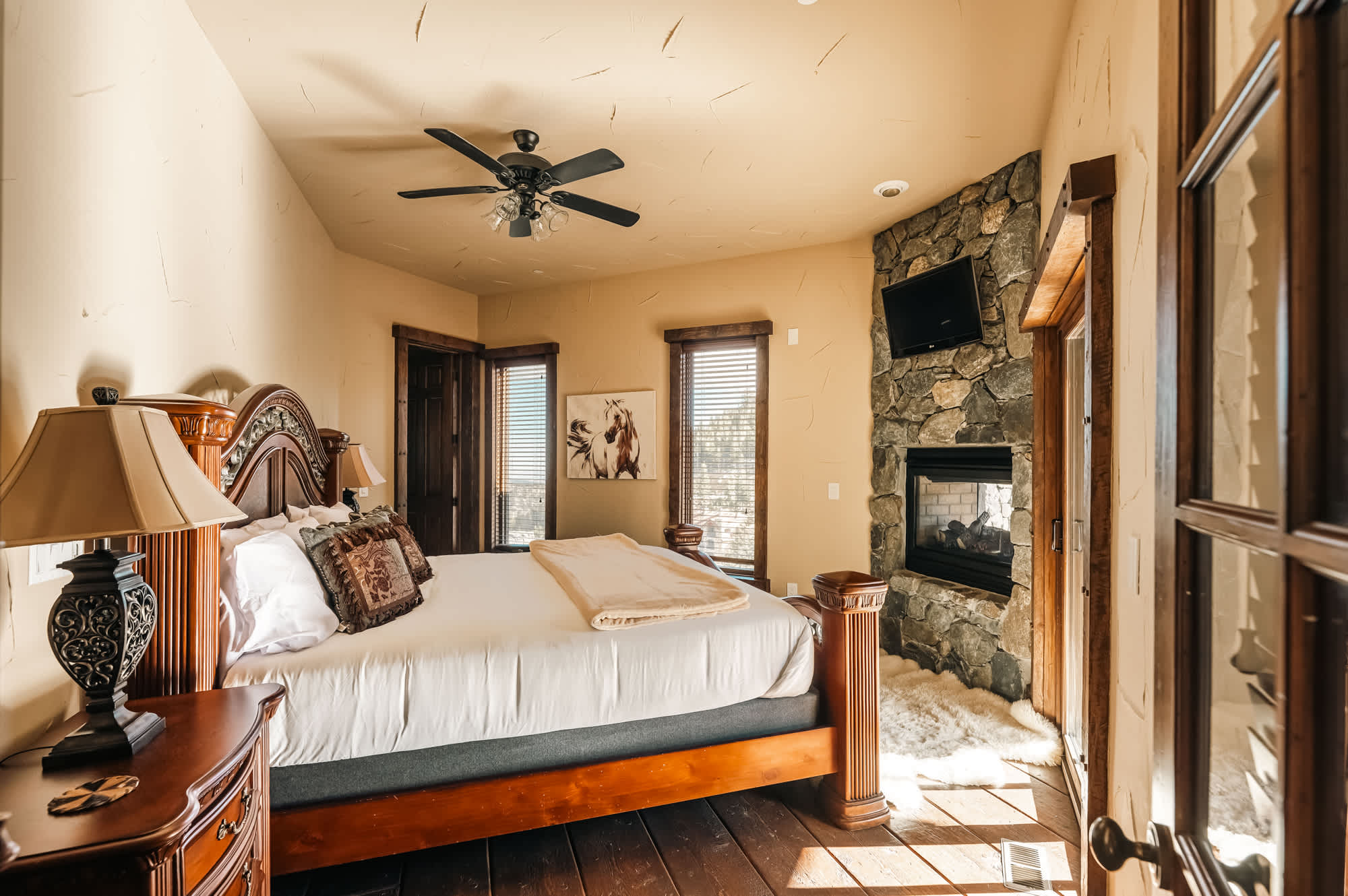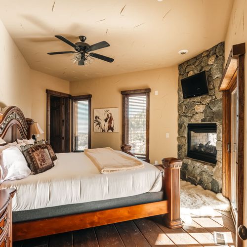 - Bedroom 4: King bed, gas fireplace, TV, private ensuite, shared balcony access