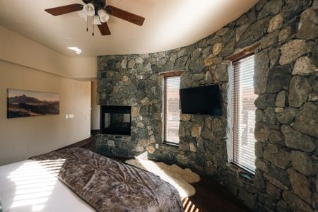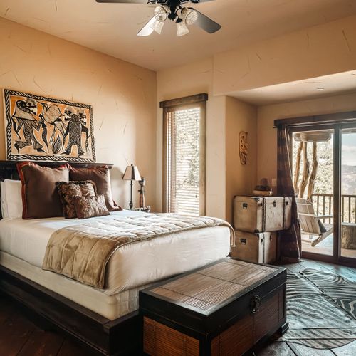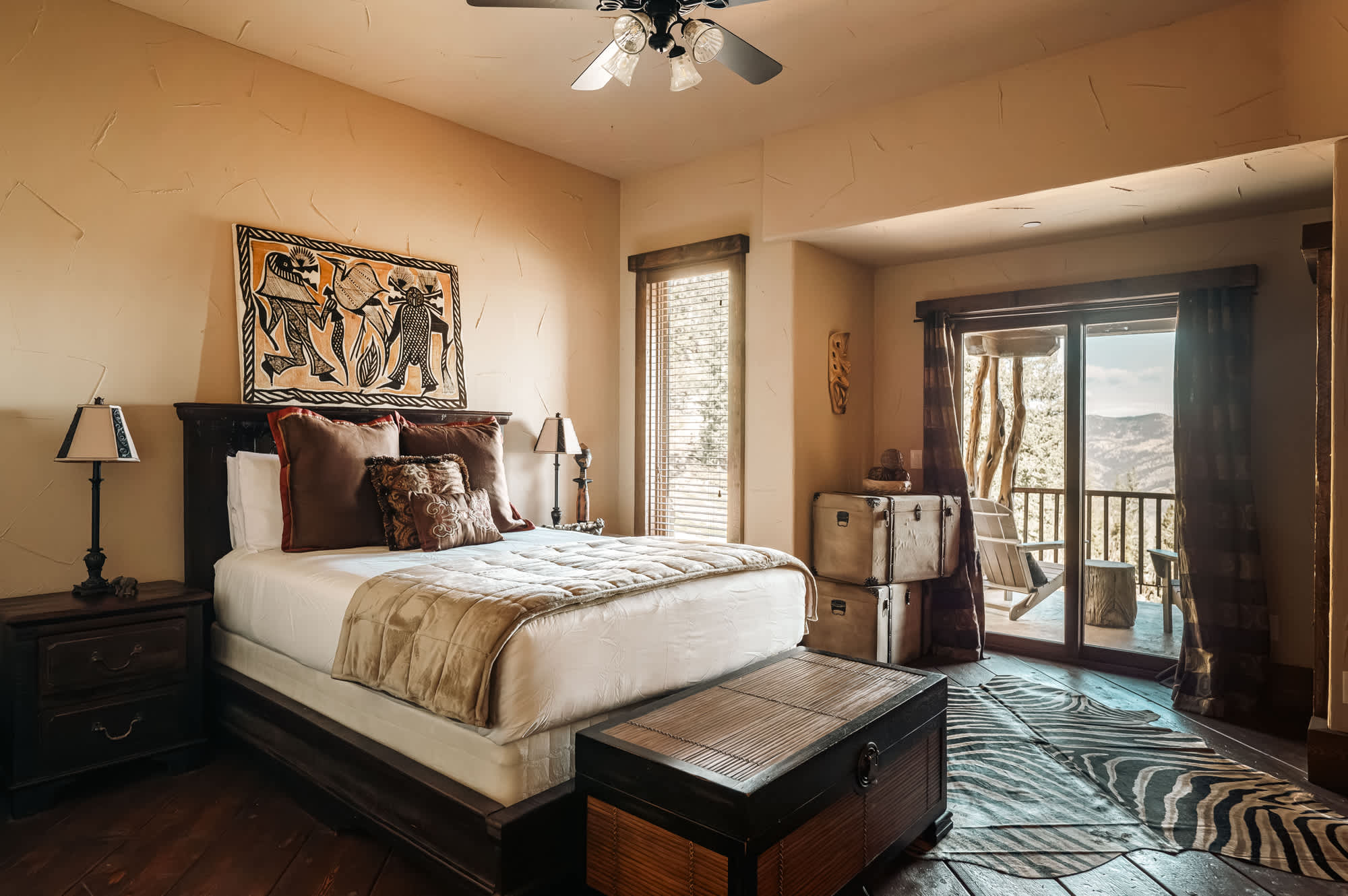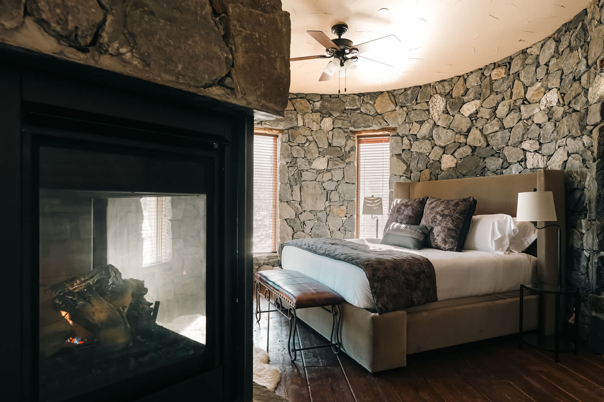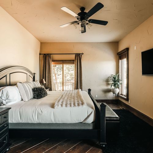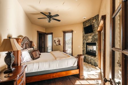 - Bedroom 4: King bed, gas fireplace, TV, private ensuite, shared balcony access