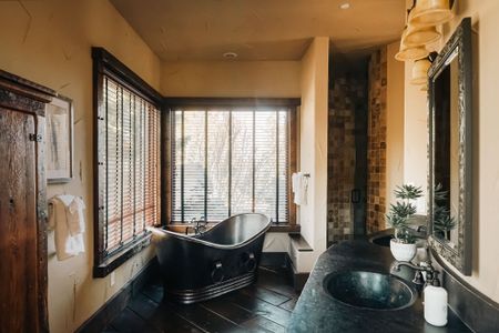 - Spa-style ensuite with dual vanities, soaking tub, and walk-in shower