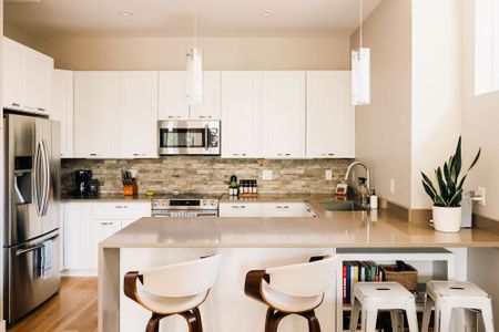 • Open kitchen with stainless appliances and island seating