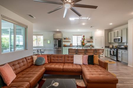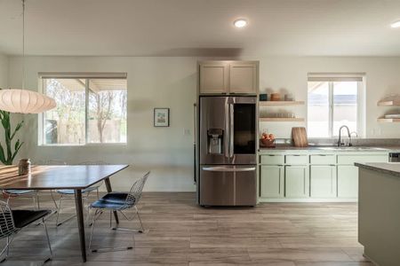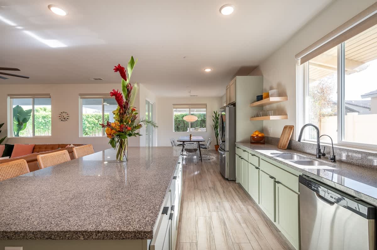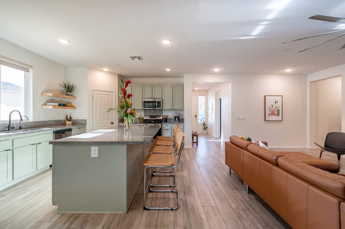 From the moment you walk into the home, you will be impressed by the large open-concept design with a connected living room, kitchen, and dining area that is PERFECT for large groups. The kitchen has a large island with beautiful custom cabinets that have recently been repainted with a soft sage color to add light to the space. The kitchen is fully equipped with practically every utensil and cooking appliance you could possibly need! The open-concept design makes it so that whether you are eating, cooking, or relaxing in the living room, you are always with your friends and family!