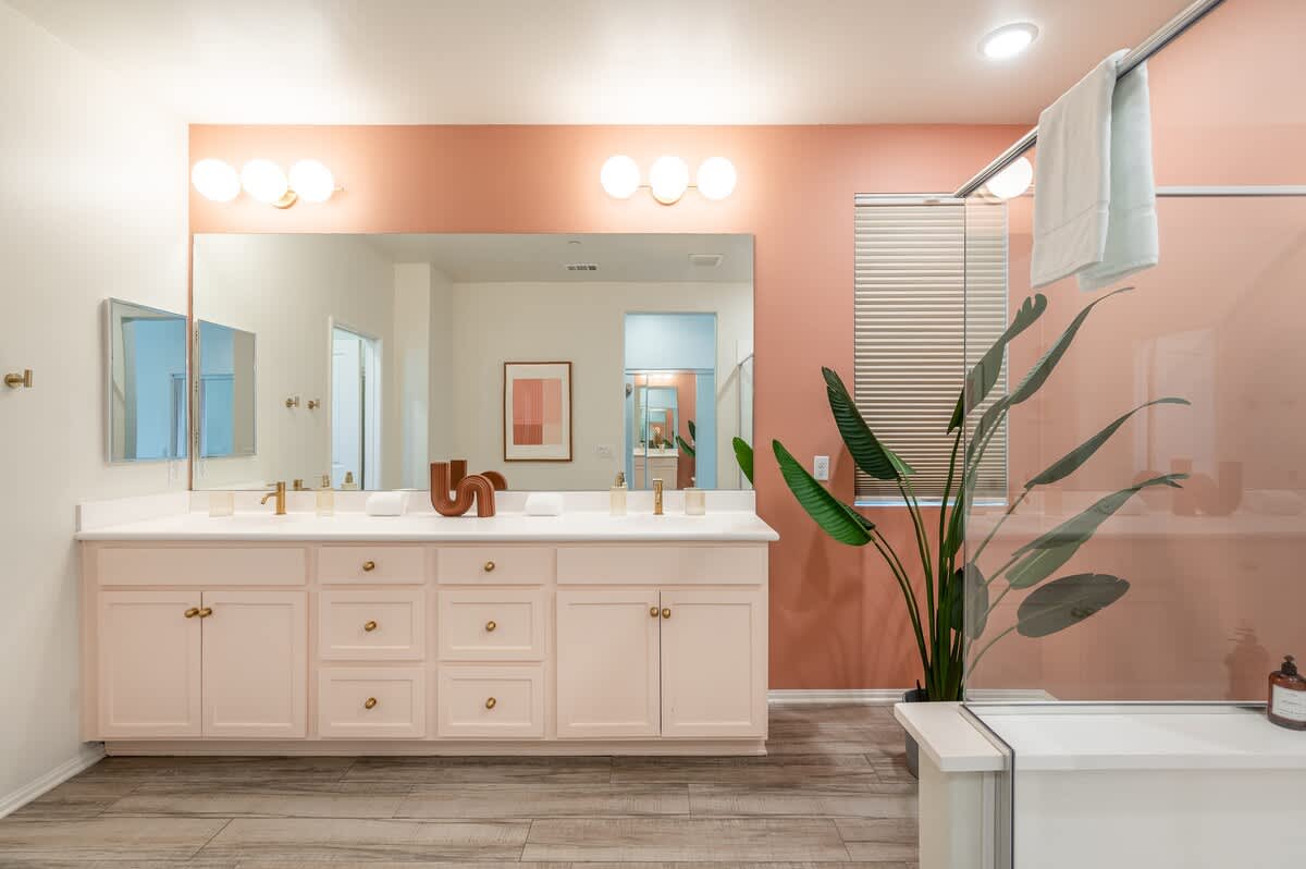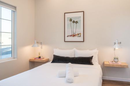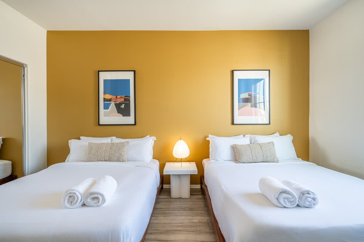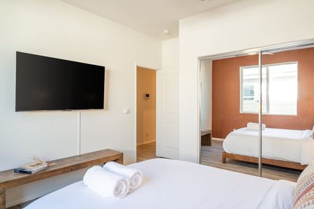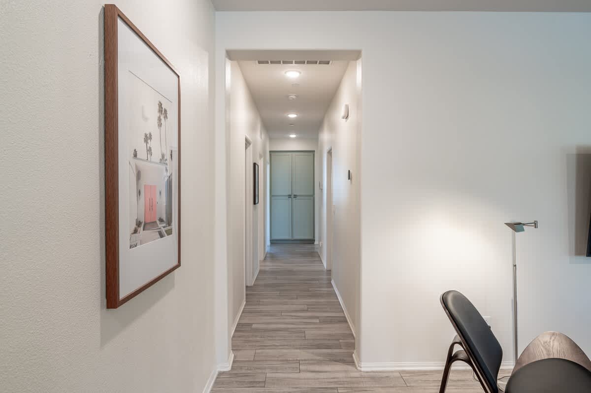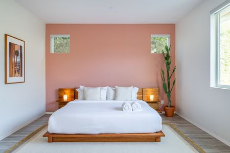 The home has 6 large bedrooms, including the 6th bedroom with a full ensuite bath, which is private and only accessible from the patio. The spacious primary bedroom has a king-size bed and features a gorgeous en-suite bathroom. The other bedrooms have low platform king and queen beds, sharing 2 full bathrooms. In one of the bedrooms, you'll find both a twin bed and a queen bed. We provide fresh linens for every room, as well as towels for every guest.