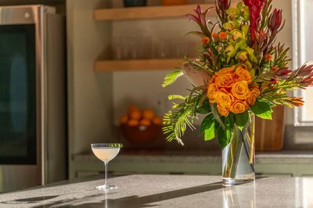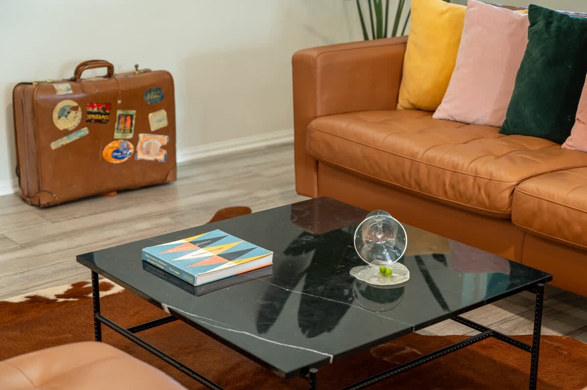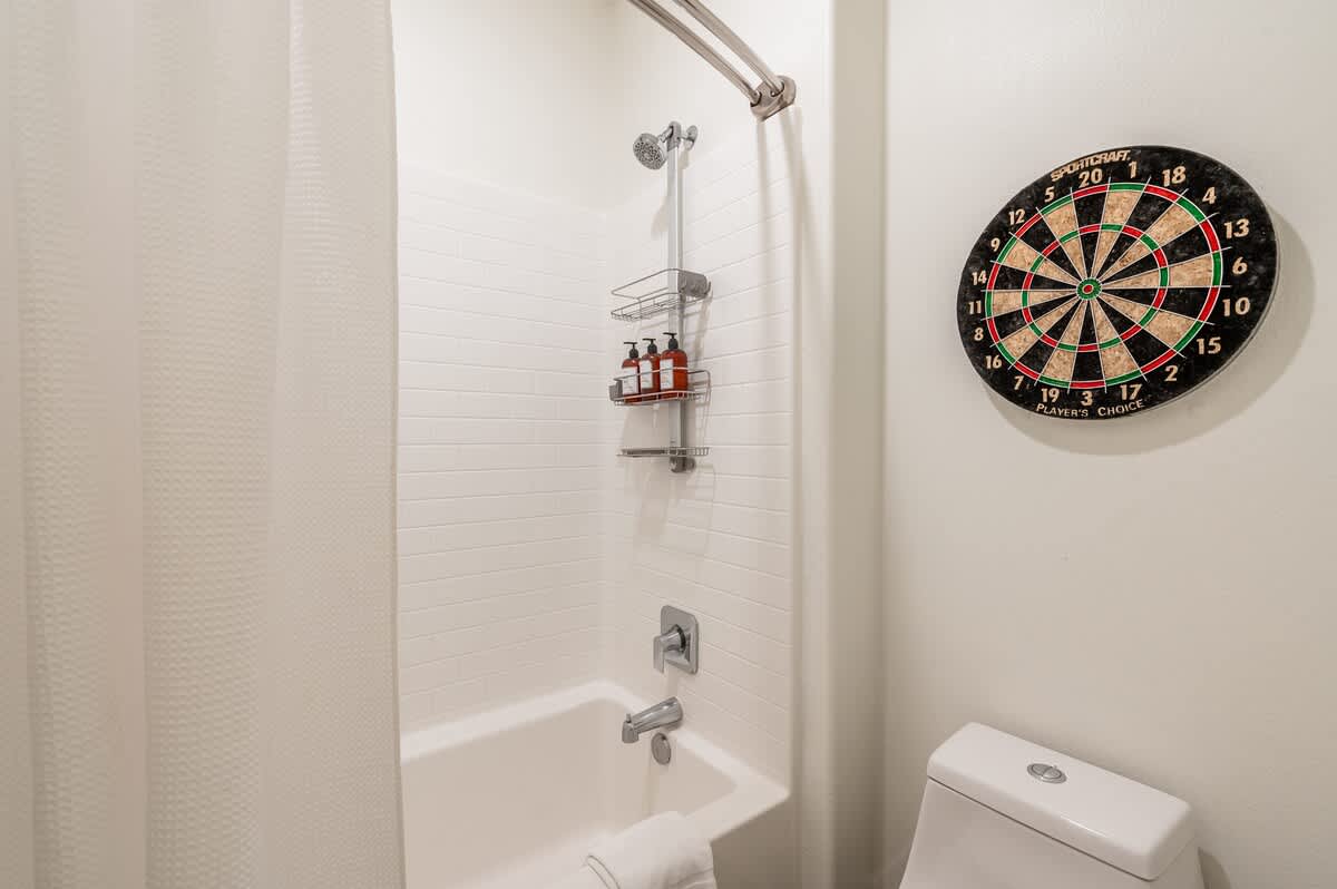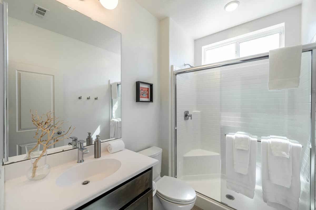 The home has 6 large bedrooms, including the 6th bedroom with a full ensuite bath, which is private and only accessible from the patio. The spacious primary bedroom has a king-size bed and features a gorgeous en-suite bathroom. The other bedrooms have low platform king and queen beds, sharing 2 full bathrooms. In one of the bedrooms, you'll find both a twin bed and a queen bed. We provide fresh linens for every room, as well as towels for every guest.
