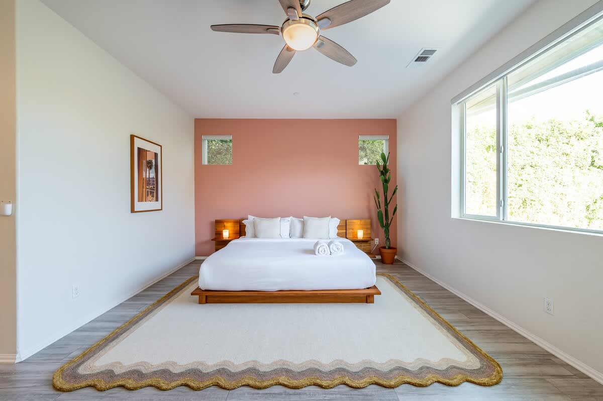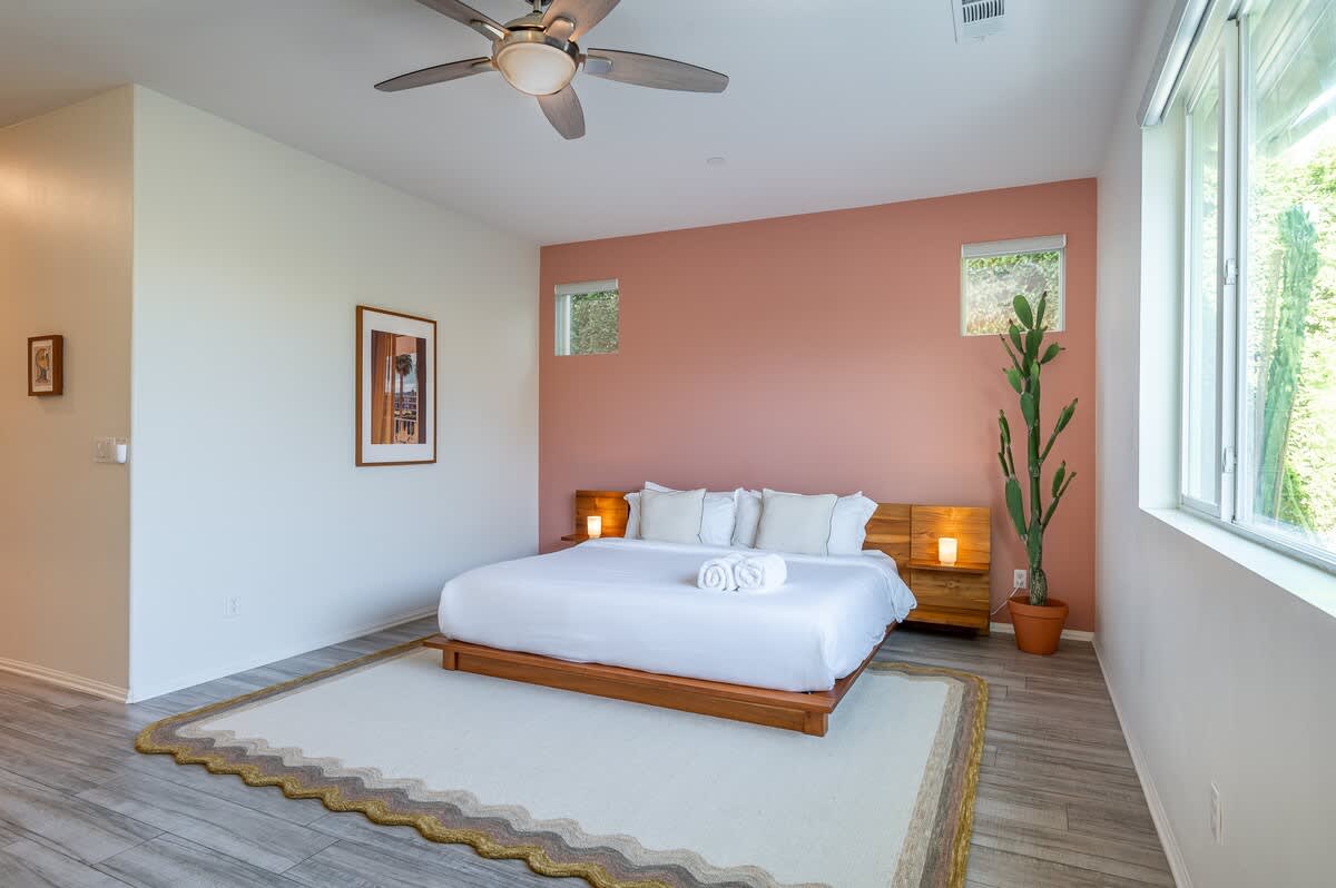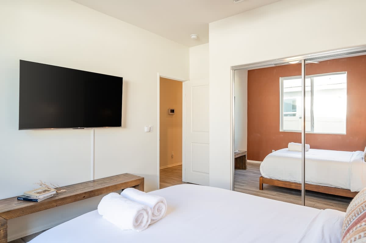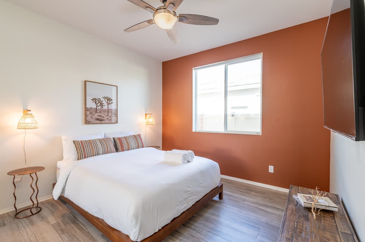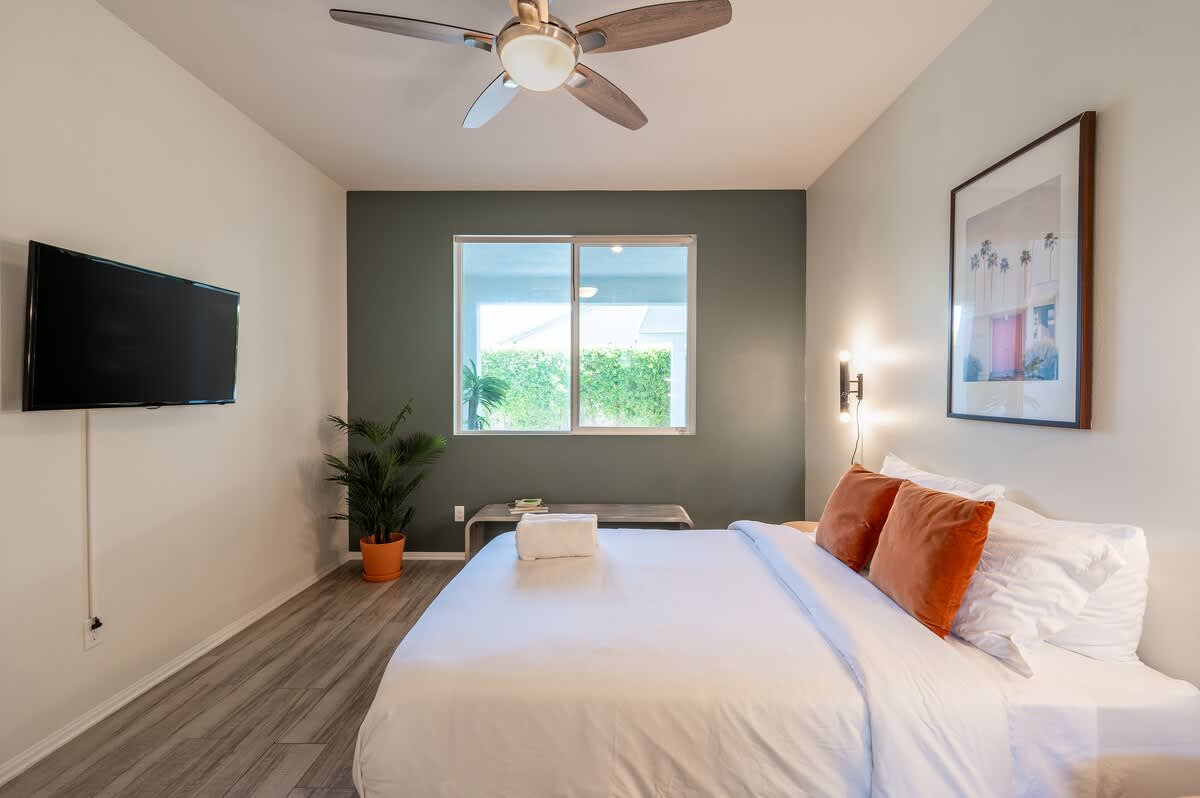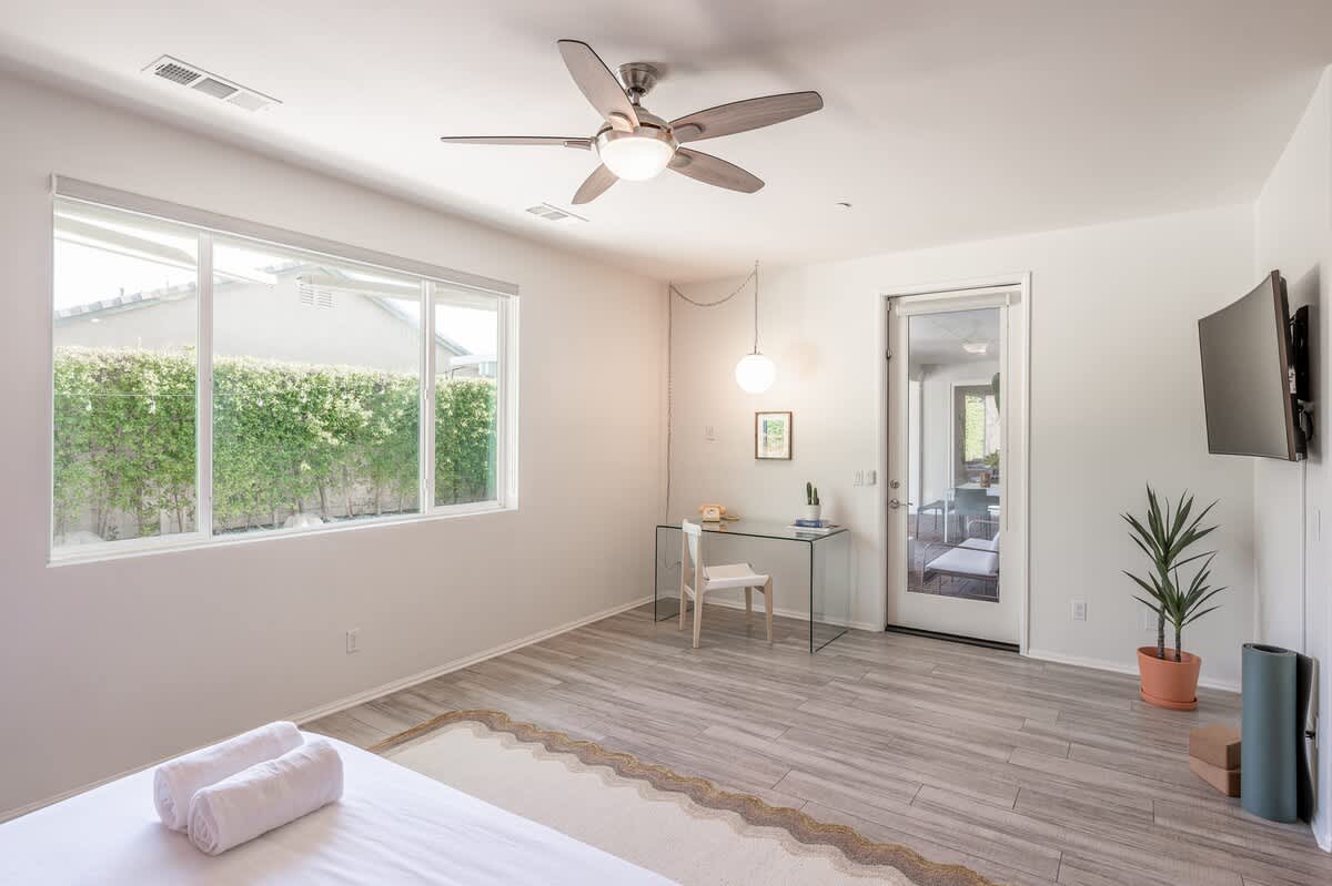 âą Bedroom #1 (primary): King bed with built-in nightstands, ensuite bath, smart TV, table lamps, designated workspace, walk-in closet, luggage racks, ceiling fan, private entrance to backyard