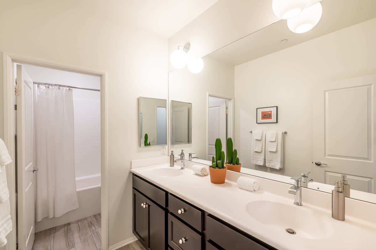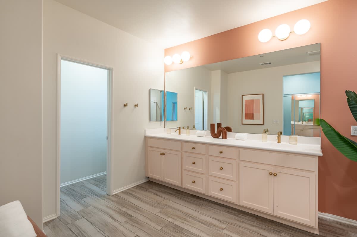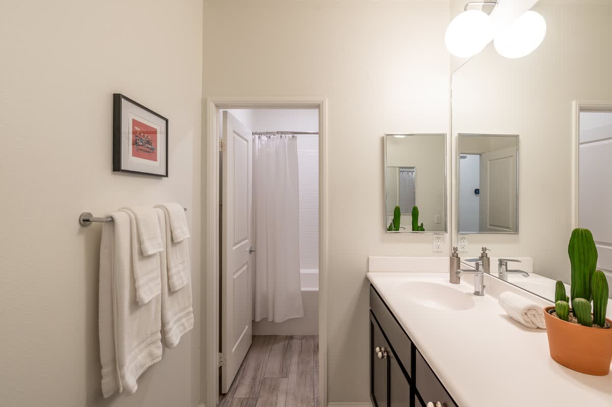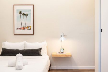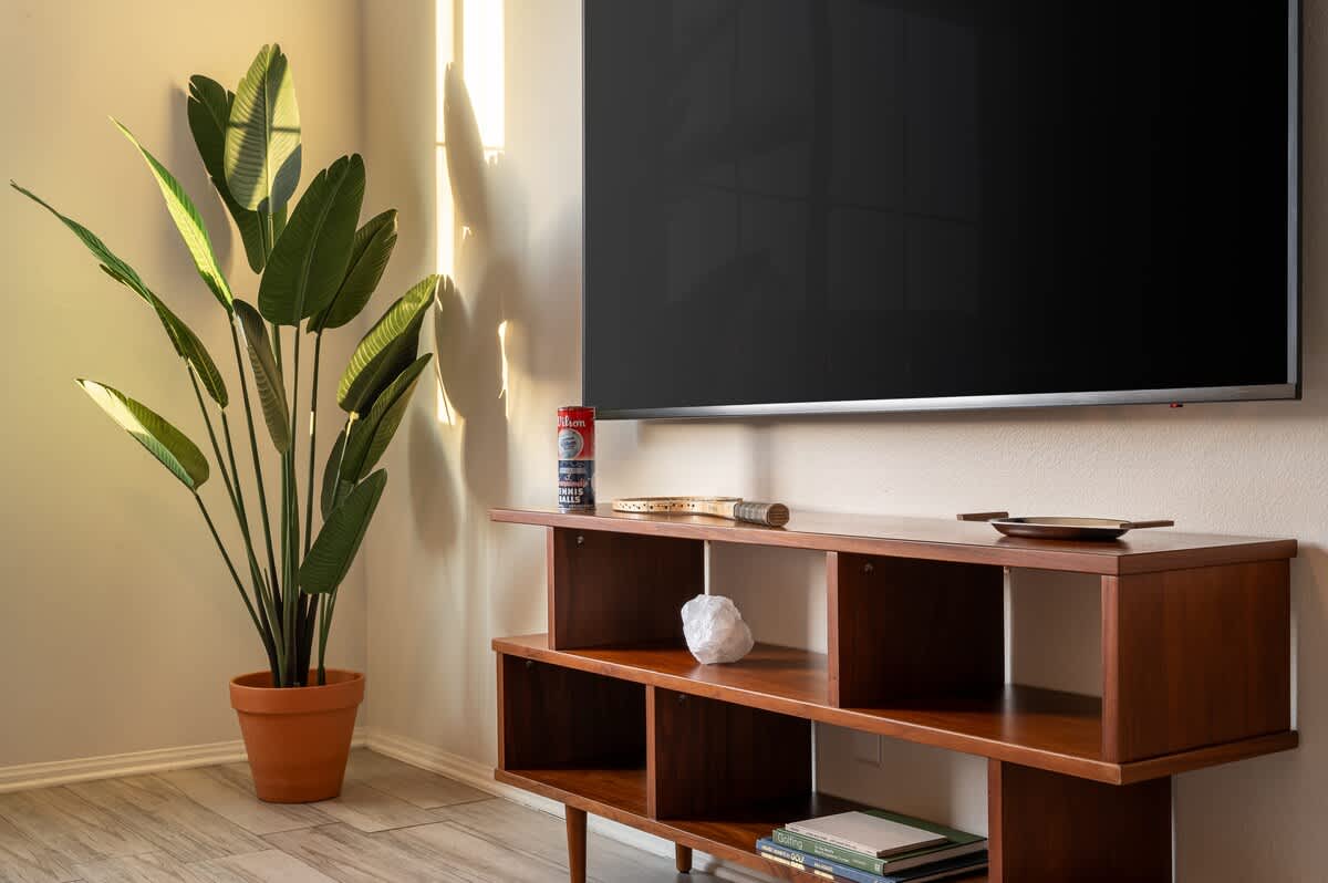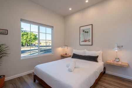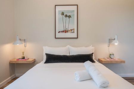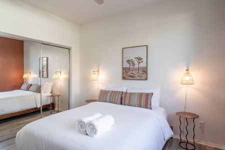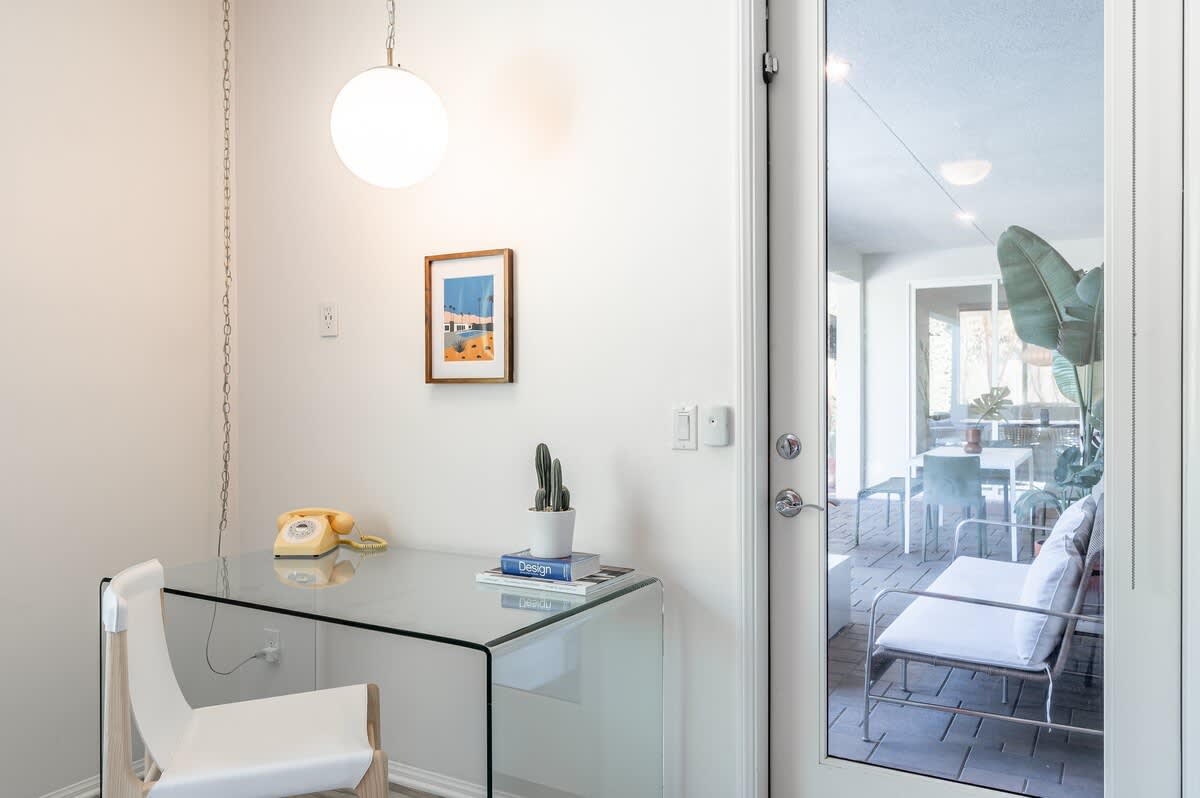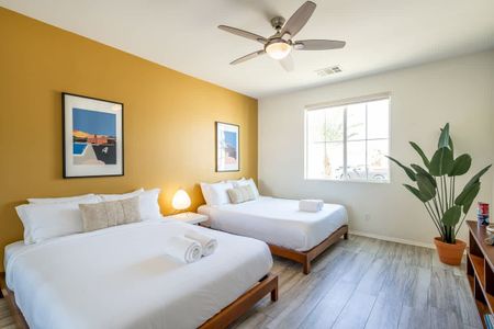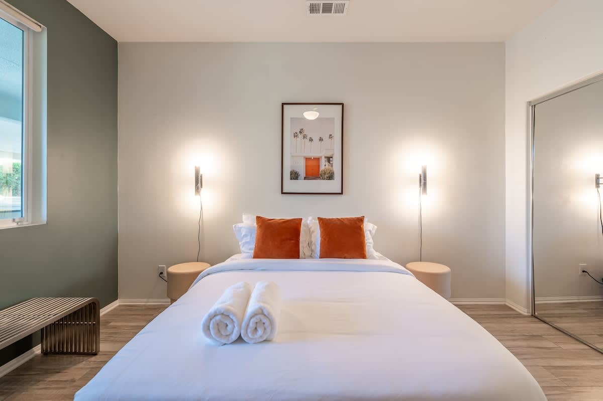 âą Bedroom #1 (primary): King bed with built-in nightstands, ensuite bath, smart TV, table lamps, designated workspace, walk-in closet, luggage racks, ceiling fan, private entrance to backyard