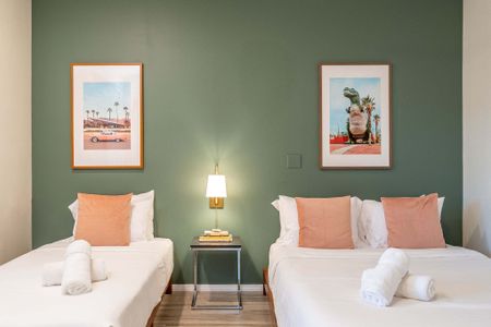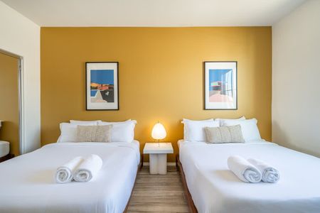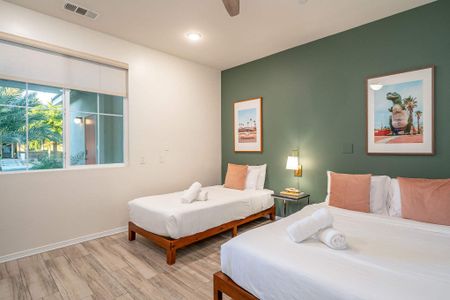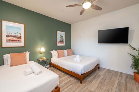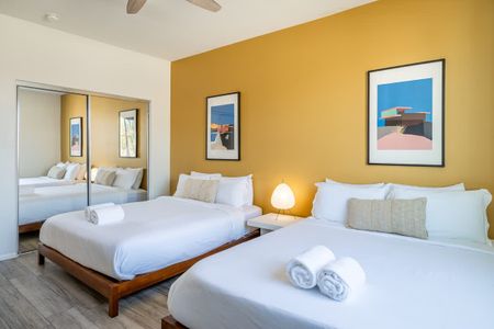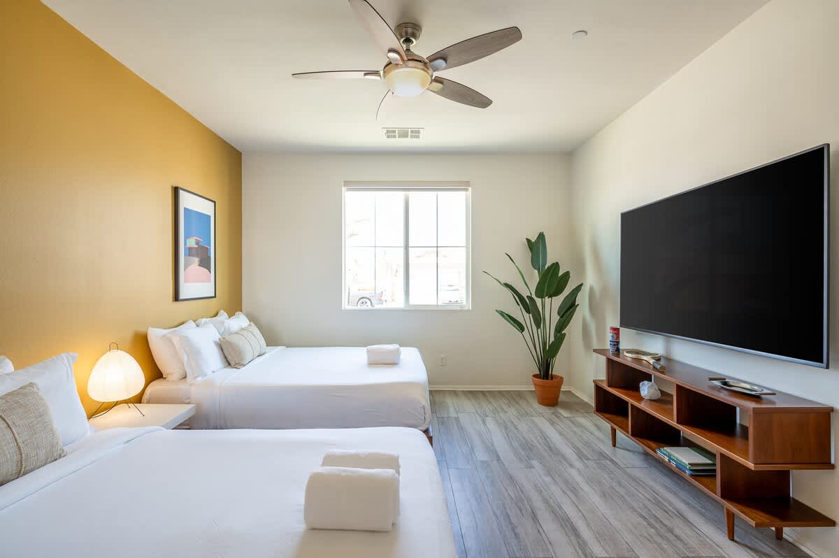 âą Bedroom #5: 2 queen beds, nightstands, sconces, bench end, smart TV, ceiling fan, closet, luggage racks