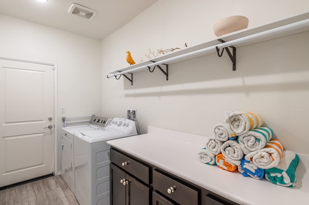 This home accommodates up to 17 guests with 6 bedrooms and 4 bathrooms. Additional spaces include an open kitchen concept with a 6-person dining table and living room area, as well as a laundry room.