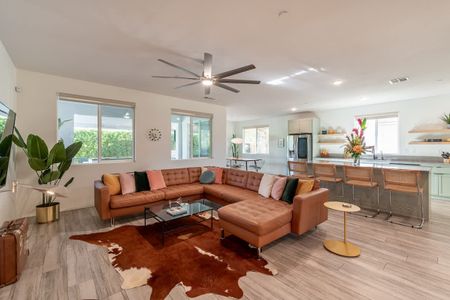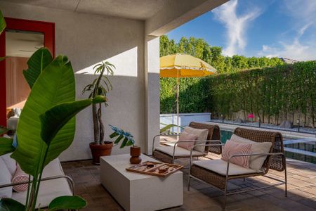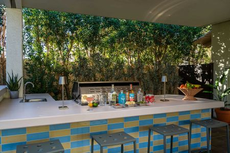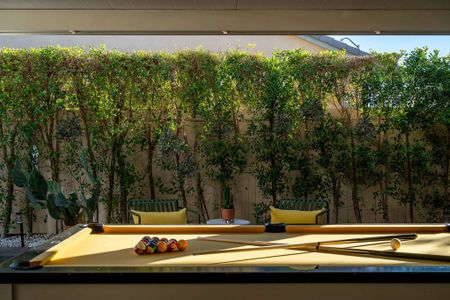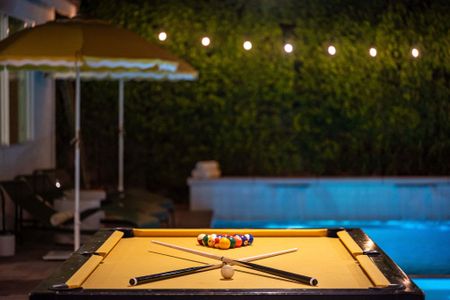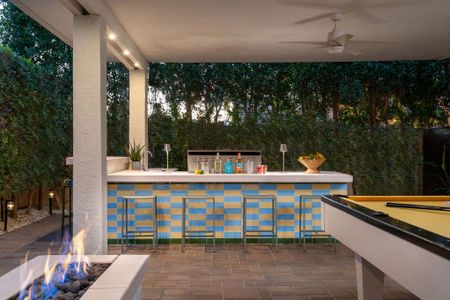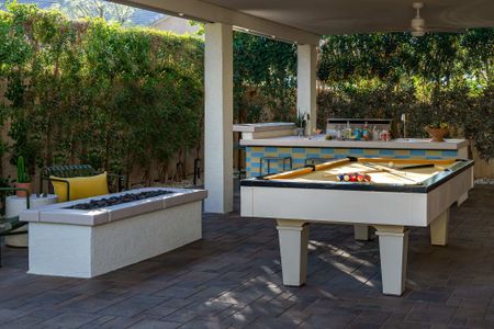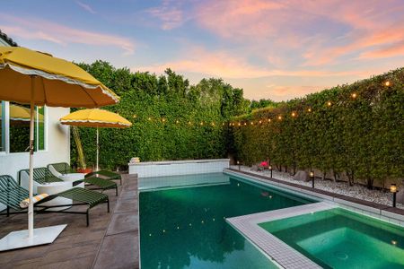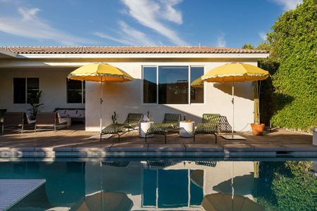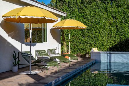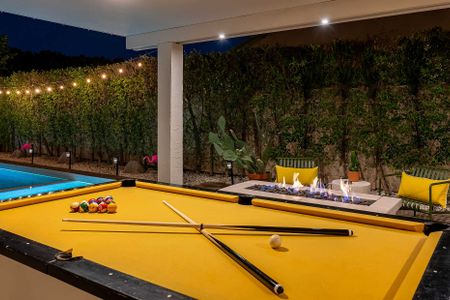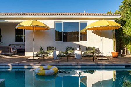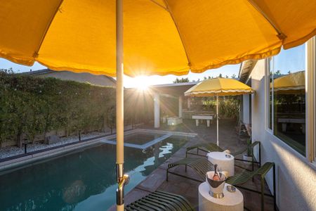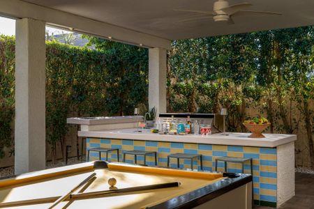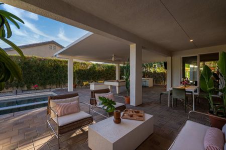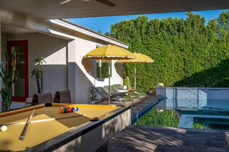 The backyard is the definition of luxury living and is exactly why people keep coming back to this home! The large backyard patio has LED lights, and ceiling fans to make sure you can entertain your friends day and night. There is a large 10-foot-long island with barstools, a mini-fridge, and a 40-inch stainless steel natural gas grill. You also have a 6-person outdoor dining table, a separate patio seating area, a natural gas custom stone outdoor fireplace, a beautiful modern 8ft pool table, and the LARGE patio covers all this! This patio area is the ultimate entertainers paradise! If you know Palm Springs living, then you know it's all about the pool! The pool and spa are custom-built with pebble tec, and color LED lights and has a Pentair automation system that gives you full control over the pool and spa features! In short, everything about this home, inside and out was made to entertain large groups.