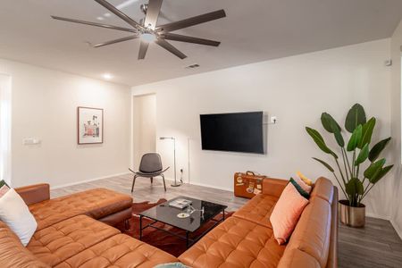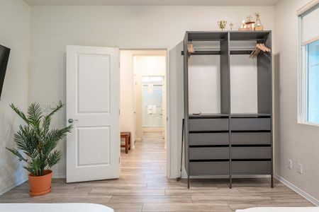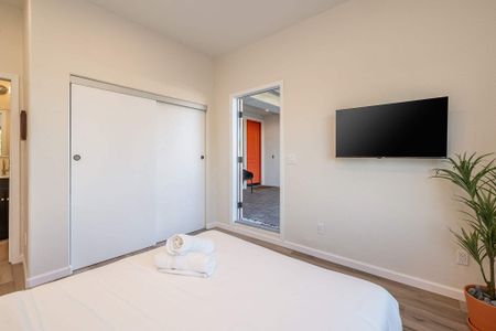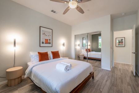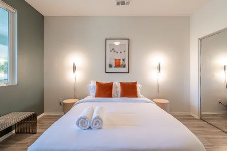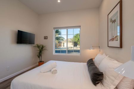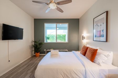 âą Bedroom #3: King bed, floating nightstands, table lamps, smart TV, ceiling fan, storage rack